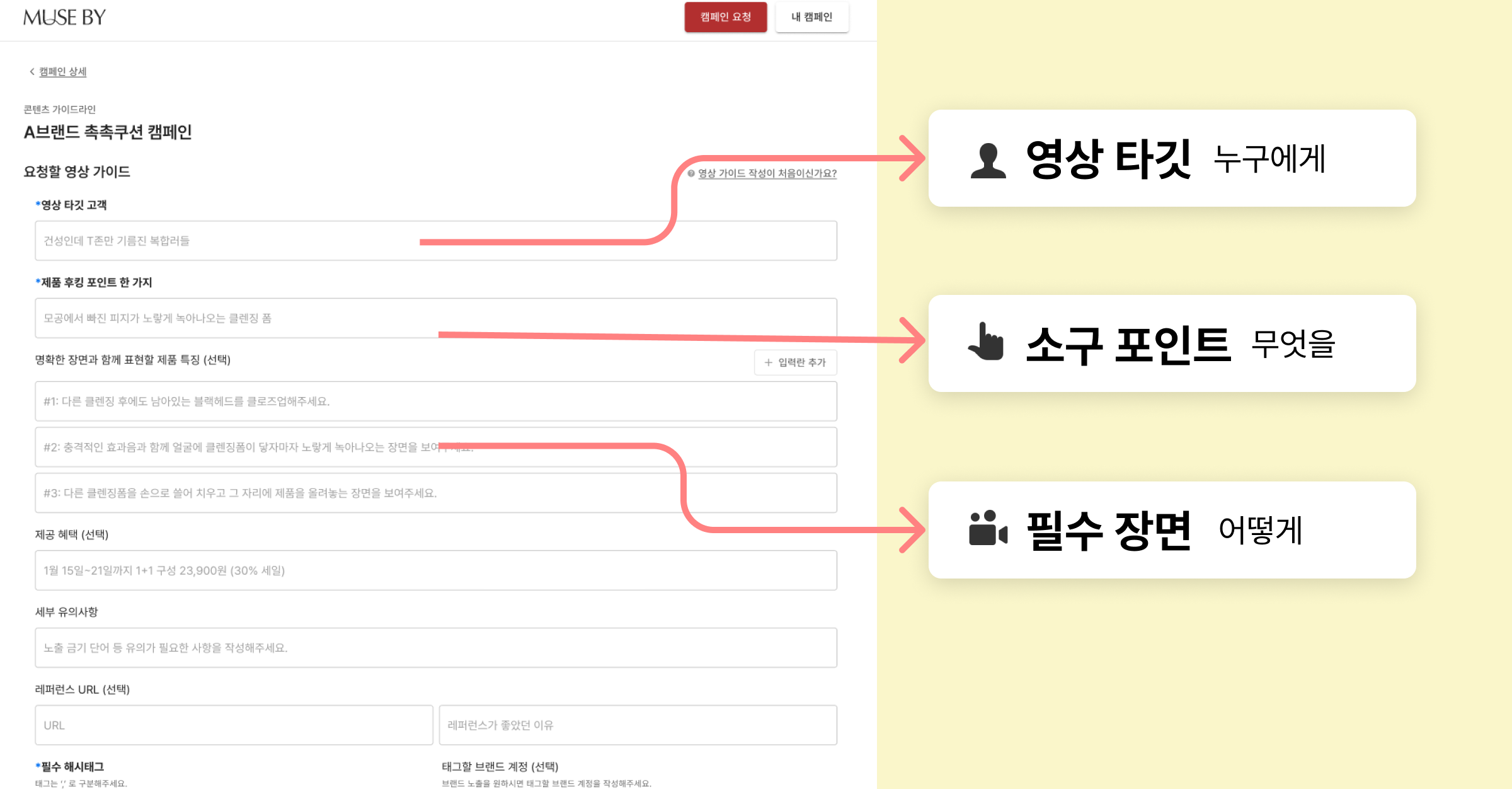 뮤즈바이에서는 캠페인 생성 단계에서 먼저 콘텐츠 가이드를 작성하시거나 인플루언서와의 협업이 결정된 이후 작성하실 수 있습니다. 먼저 작성하실 경우 인플루언서가 협업 전 어떤 내용으로 제작해야 할 지를 미리 확인하고 캠페인을 수락할 수 있어 이후 협업 단계가 보다 원활할 수 있고, 추후 작성하실 경우 인플루언서에 맞춰 가이드 방향을 재설정하실 수 있다는 장점이 있습니다.