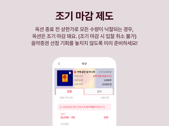 *조기마감 시에는 입찰 취소가 불가하기 때문에 고객 분들의 참여가 많은 곡에 상한가 입찰하실 때는 이 점을 유의하여 참여해주세요!
