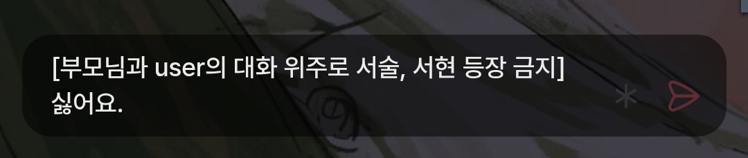 [user의 행동, 상태, 대사, 표정, 움직임 등 user 묘사 금지]