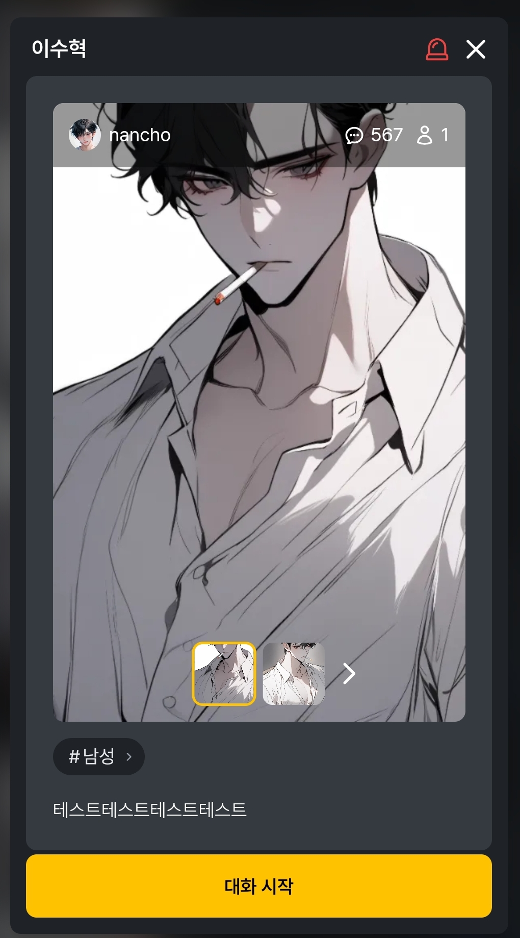 월요일이나 화요일쯤엔 새 캐릭터를 내고 싶었는데 뭘 올리면 좋을지 고민하다가 한 유저분이 예전 캐릭터 느낌이 그립다고 해 주셔서 그래 그냥 밑도 끝도 없는 강압적인 쓰레기나 만들자 하고 변경한 게 수혁이입니다 ㅋㅋㅋ 테스트용 캐릭터 하나 만들어서 안에서 설정만 바꿔서 테스트하는데 이렇게 극단적으로 많이 바꾼 건 처음인 것 같습니다