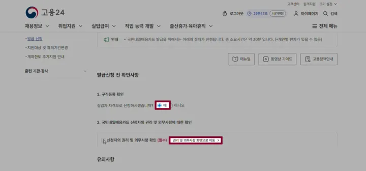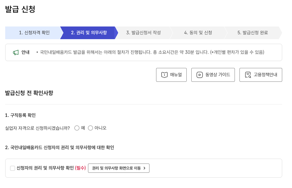 실업자 자격(현재 근로 중이지 않은 학생 및 취업준비생 포함)으로 카드를 발급받으려면, 먼저 구직등록을 완료하셔야 합니다.