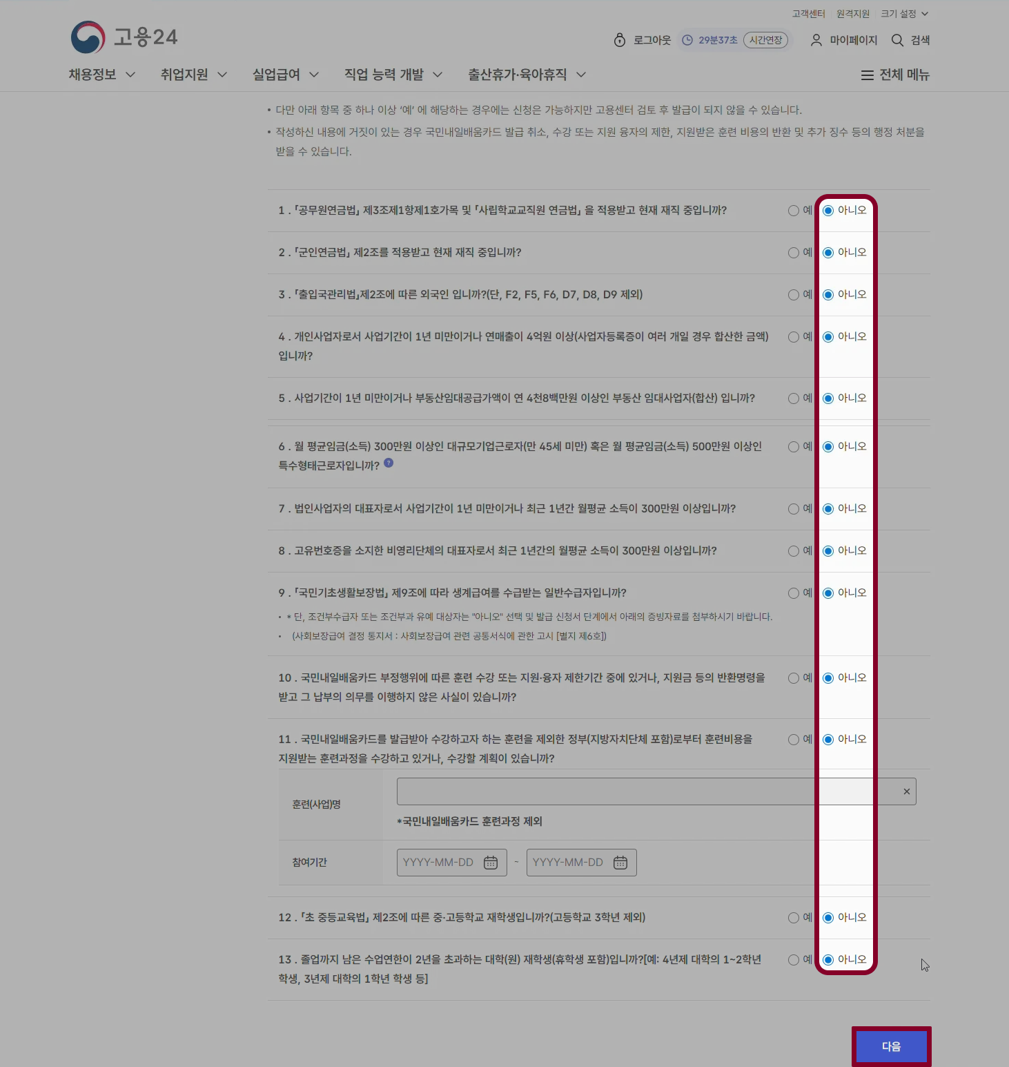 ‘아니오’ 선택의 경우 재직자용 카드를 발급받게 되며, 재직자용 KDT 단기 과정에만 수강신청이 가능합니다.
