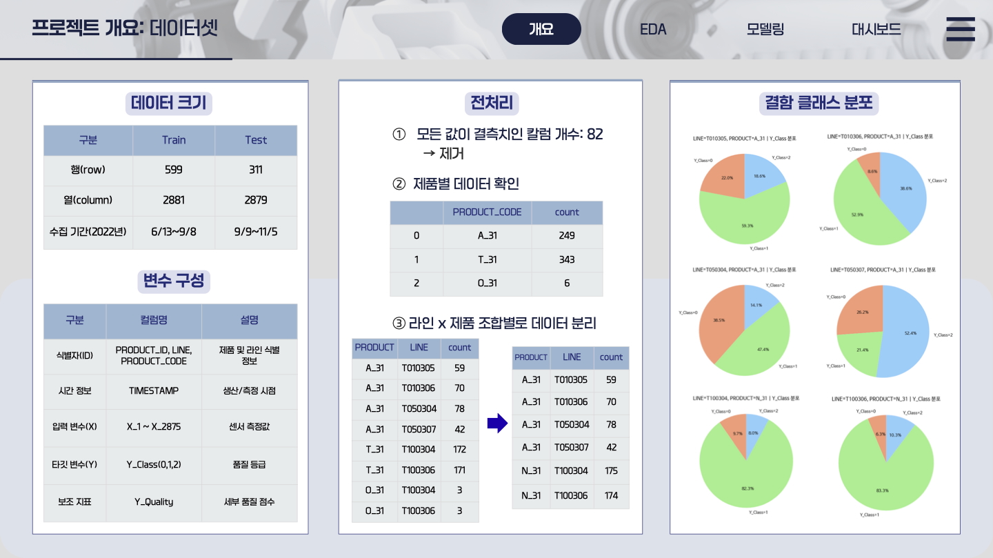 실제 제조 라인의 센서 데이터(2,800여 개)를 기반으로 품질 등급 분류 모델을 구축하고, 실시간으로 센서 변화를 시각화하는 Streamlit 대시보드를 개발했습니다.