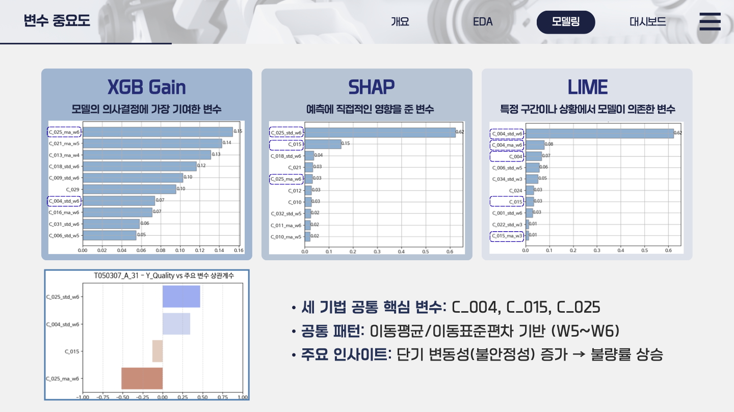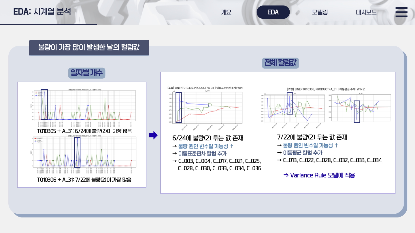 EDA 중 시계열 분석과 머신러닝, 변수 중요도 분석을 통해 실제 공정의 라인에서 어떤 공정개선이 이루어져야 하는지 도출하는 것에 집중했습니다.