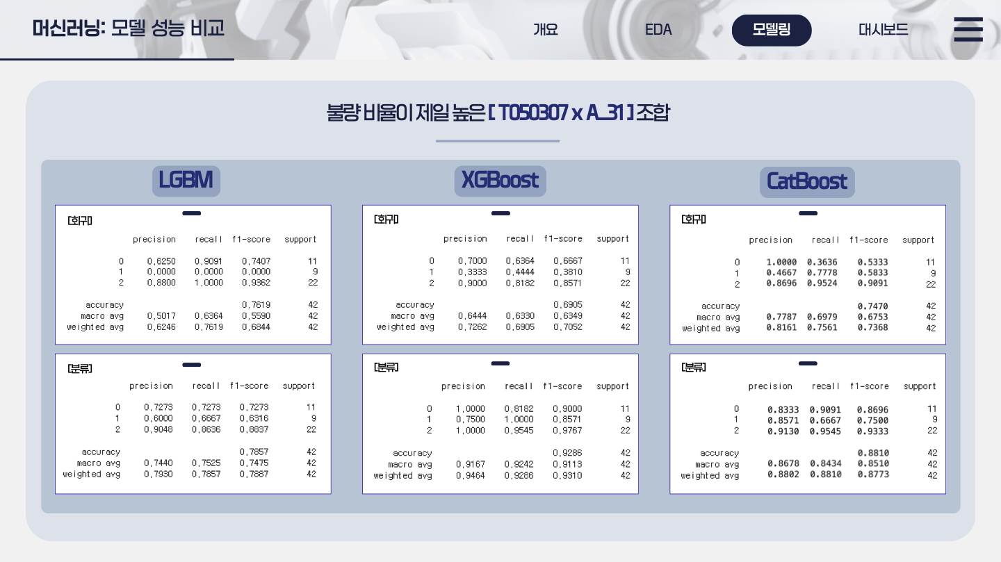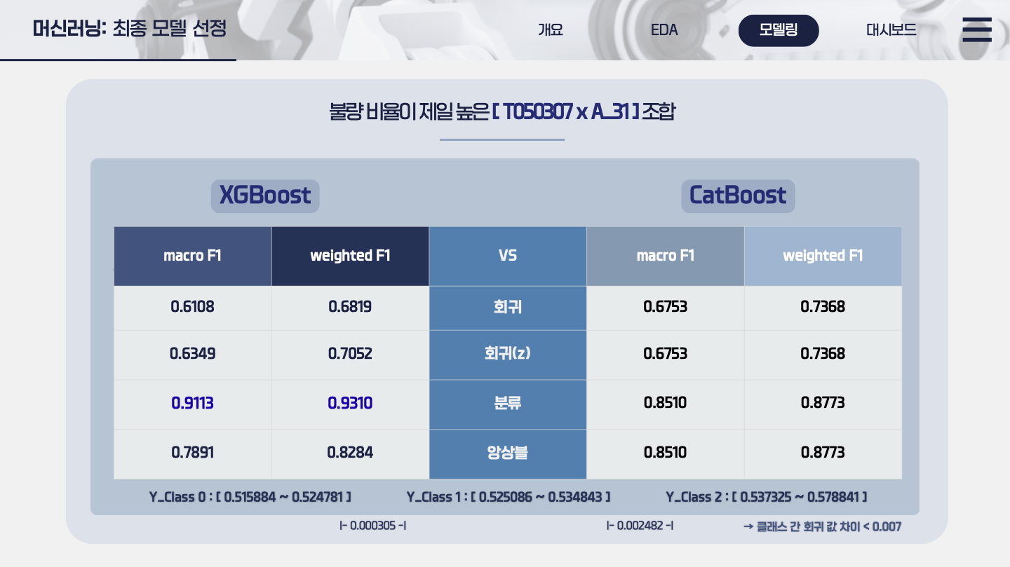 저희 팀은 3명이 함께 데이터 전처리부터 모델링, 시각화까지 전 과정을 순차적으로 수행했습니다. 모델링 단계에서는 각자 다른 알고리즘을 맡아 성능을 개선했으며, 저는 XGBoost 모델을 담당해 품질(Y_Class) 예측 정확도를 향상시켰습니다.