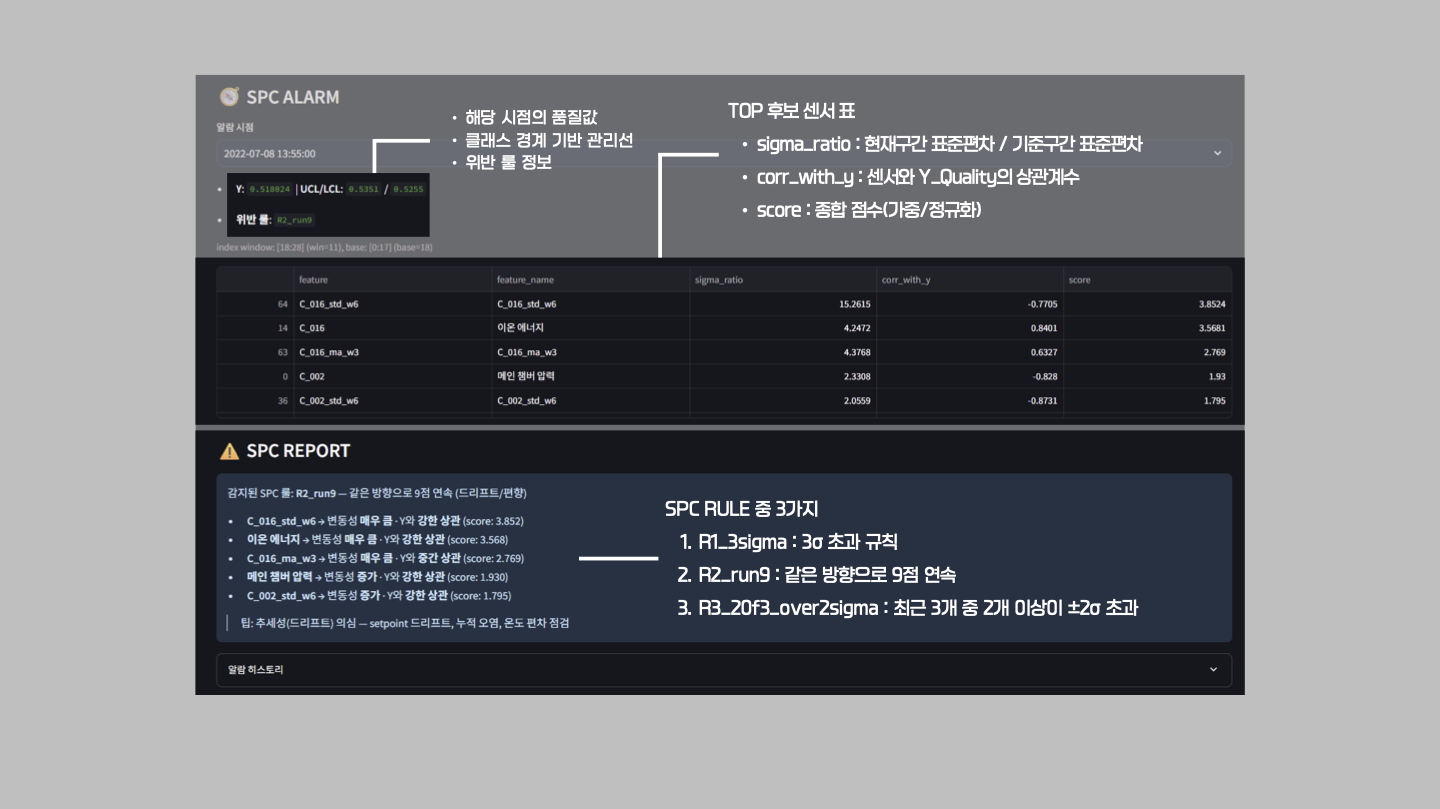 초기엔 복잡하고 미흡했지만, SPC Rule(3σ, Run9, 2σ 초과) 기반의 이상 감지 기능과 실시간 경보 패널을 추가하며 점점 완성도를 높였습니다.