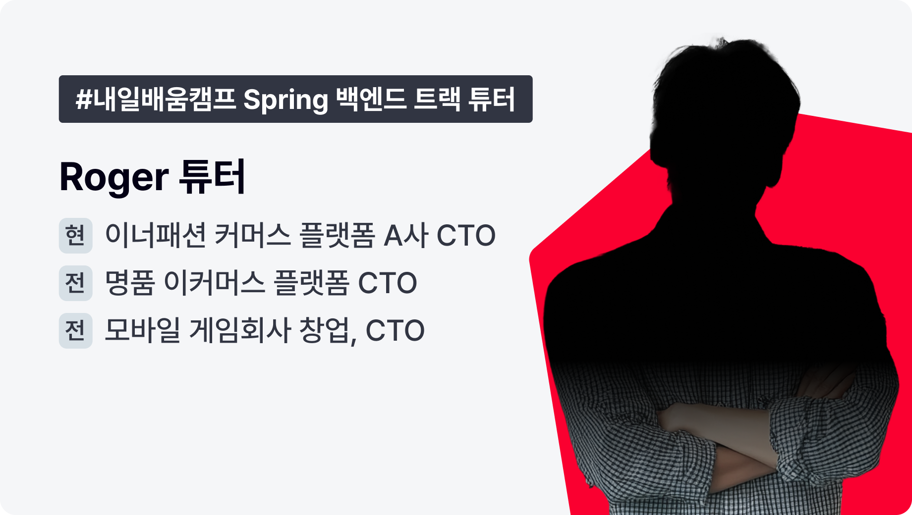 Roger 튜터님은 여러 서비스의 기획부터 운영까지 책임지는 CTO 경험을 가진 분입니다. 자바와 스프링을 중심으로 한 백엔드 개발은 물론, AWS 기반 인프라 구성과 데이터베이스 설계, 필요에 따라 Node.js와 Python까지 활용하며 서비스 전반을 이끌어 왔습니다.