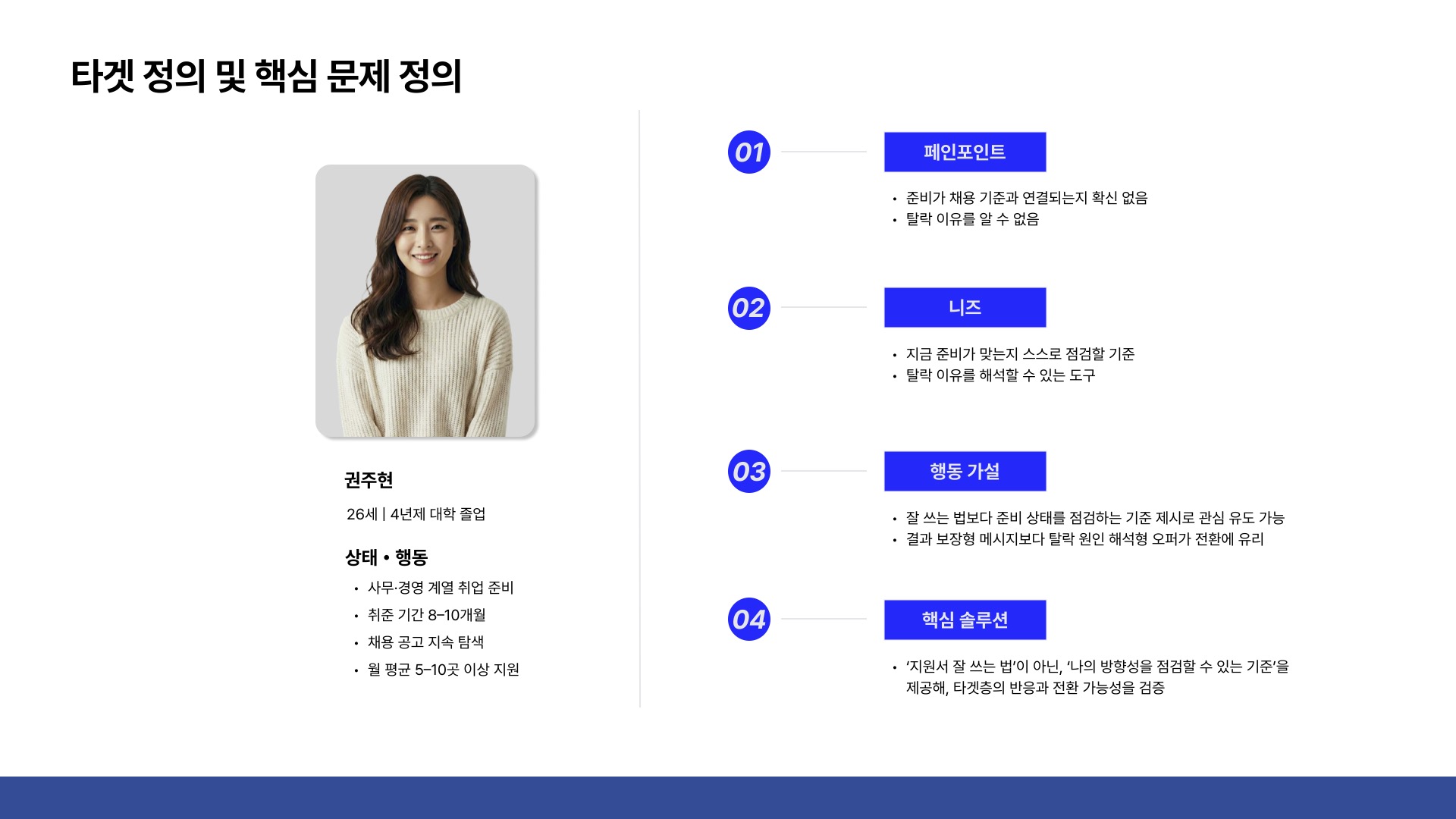 콘텐츠 마케팅 프로젝트 취업 준비 JD 분석 가이드북 광고는 취업 준비생의 지원 판단 기준 부재 문제를 해결하기 위해 가이드를 무료 배포하고, 이 메시지가 실제 리드 전환으로 이어지는지 검증한 프로젝트입니다.