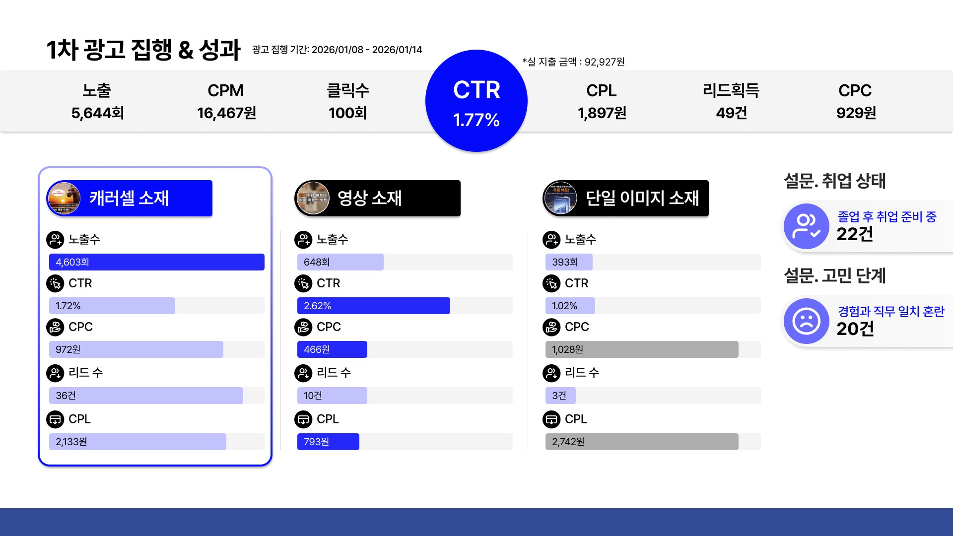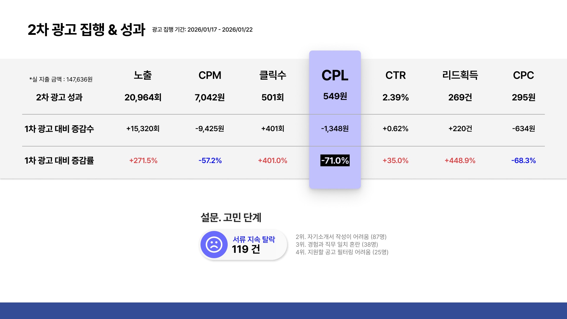 특히 1차 광고 데이터를 바탕으로 메시지 방향과 소재 구조를 재정비해 2차 광고에서 콘텐츠가 관심에서 리드 전환으로 이어지는 과정을 실험하고 고도화했습니다.