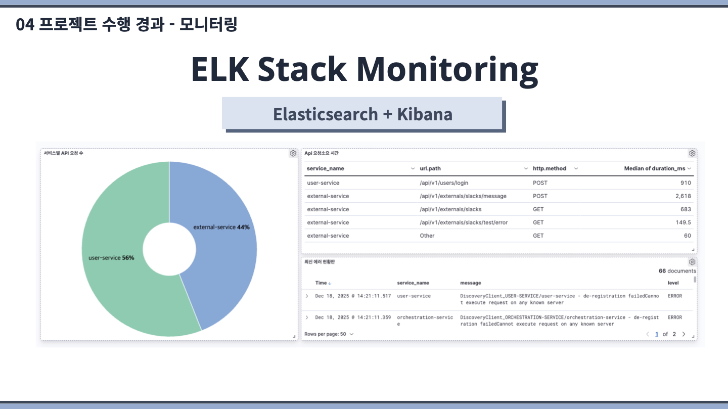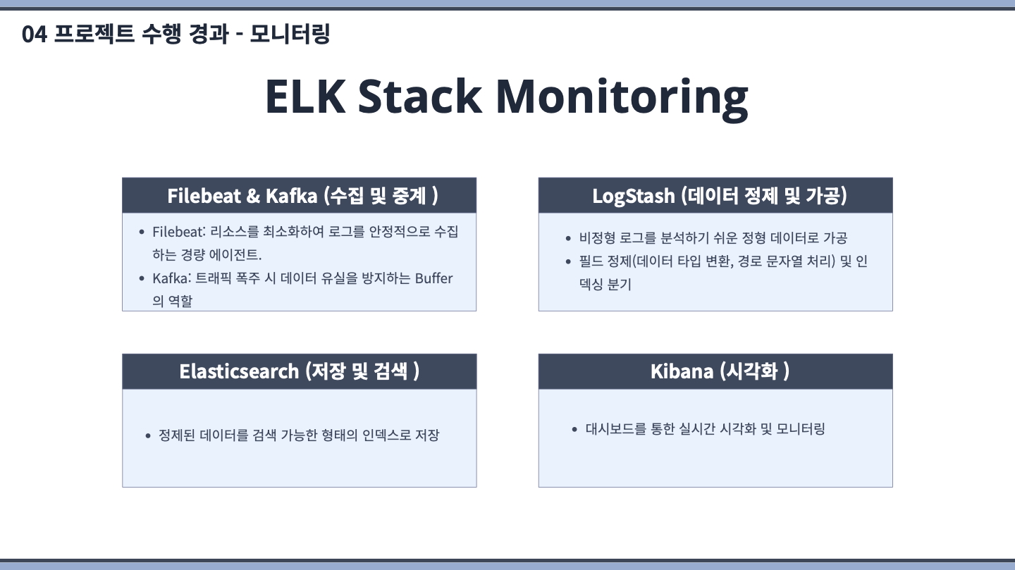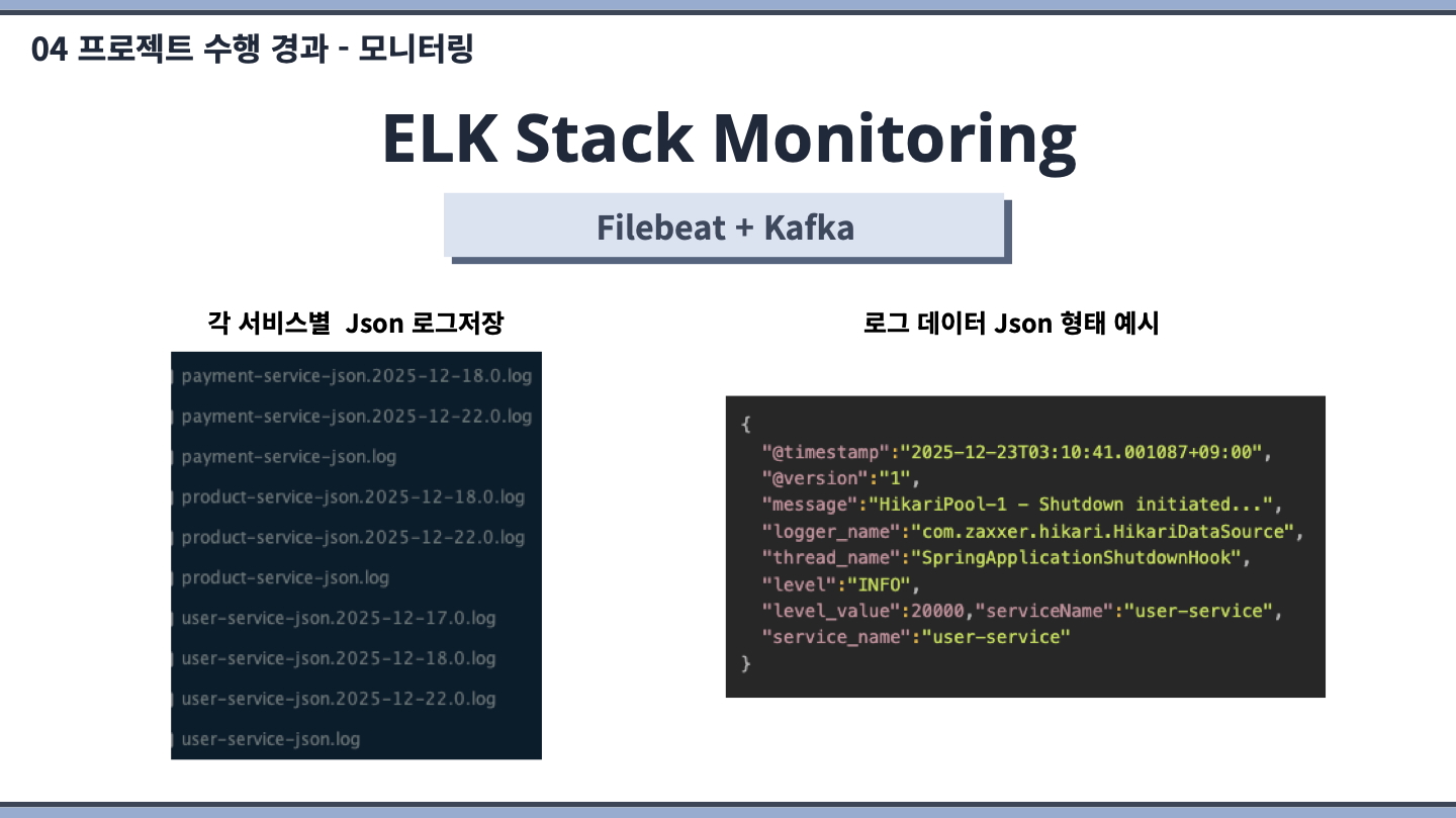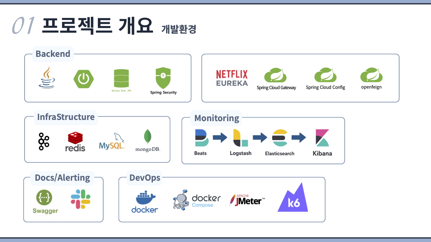장바구니(Cart), 외부(External), 공통라이브러리, 모니터링 부분을 담당했습니다. 모니터링 시스템에 집중하여 개발했습니다.