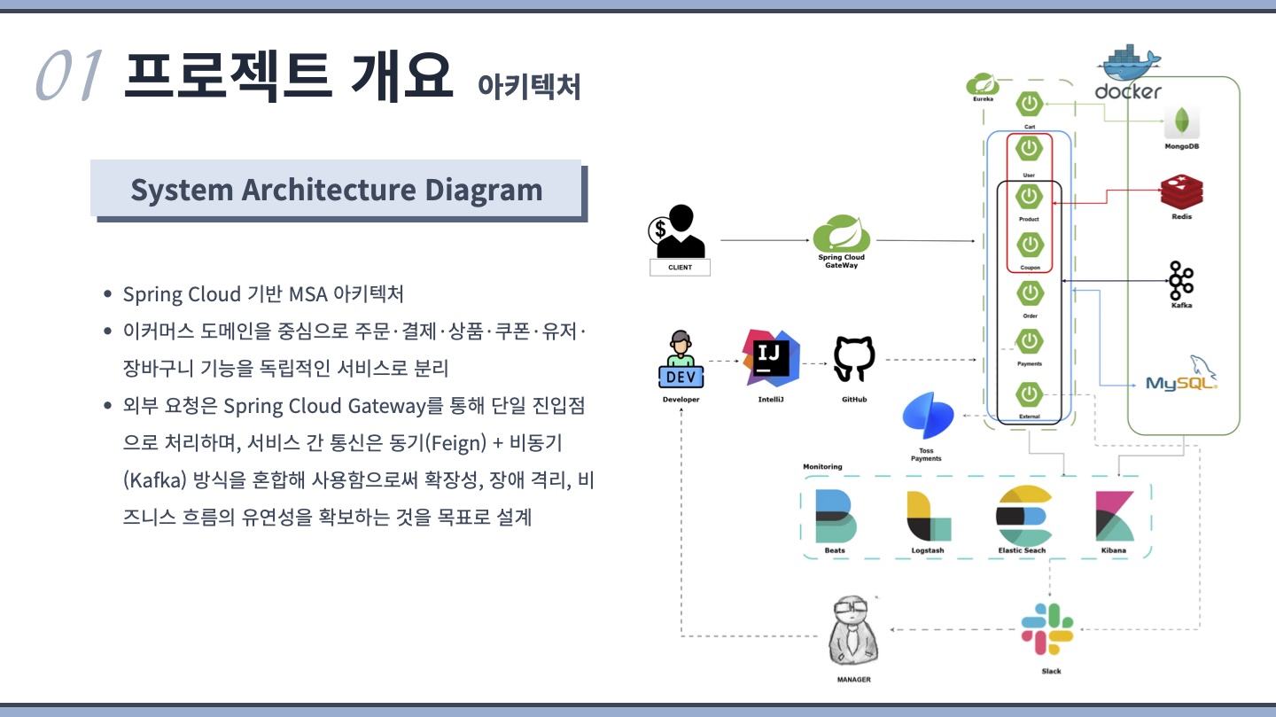 MSA 아키텍처를 기반으로 핵심 커머스 기능을 유연하게 제공하는 C2C 온라인 쇼핑 플랫폼입니다. 상품 검색부터 장바구니, 주문, 결제까지의 이커머스 핵심 흐름을 MSA 구조로 구현하여 확장성과 안정성을 고려한 쇼핑 서비스 입니다.