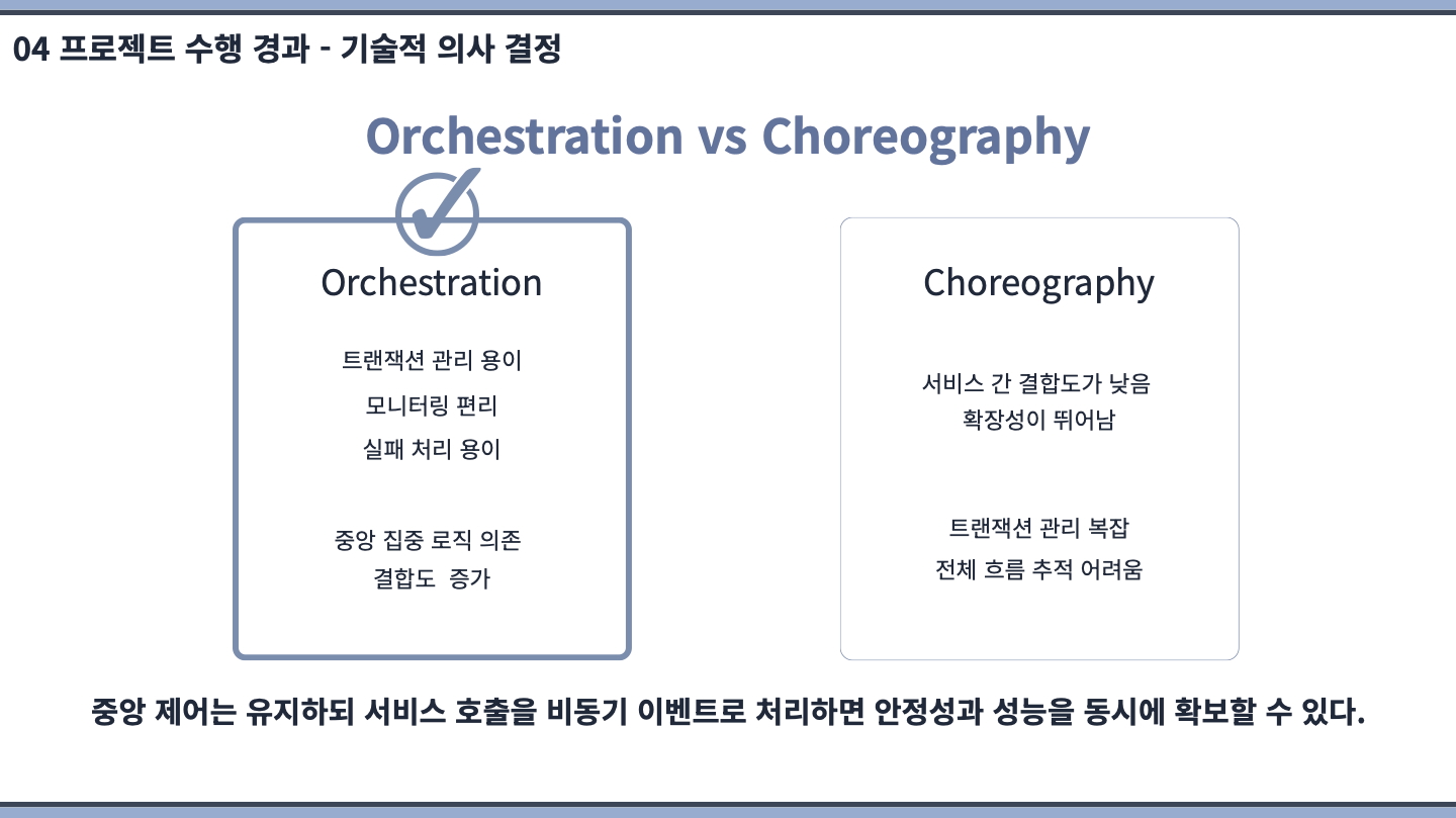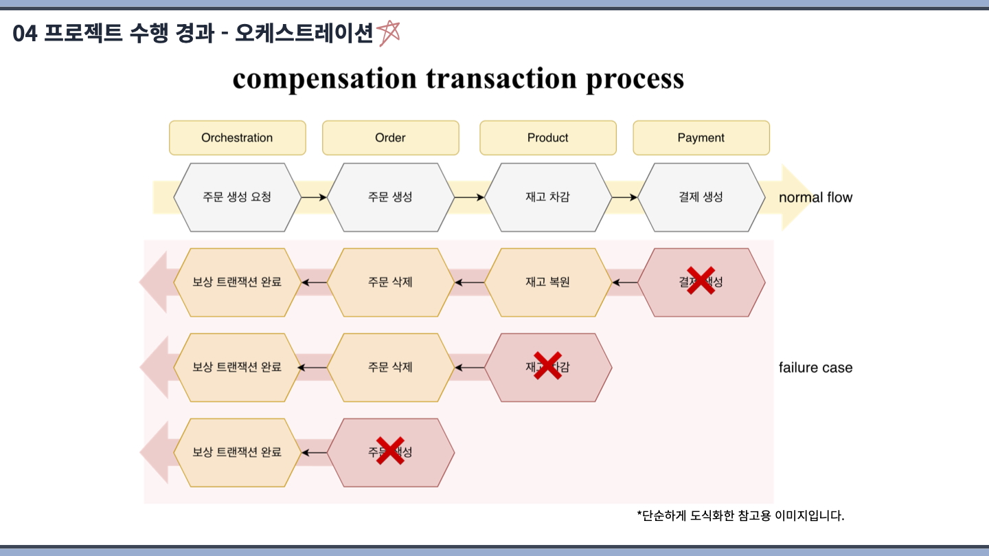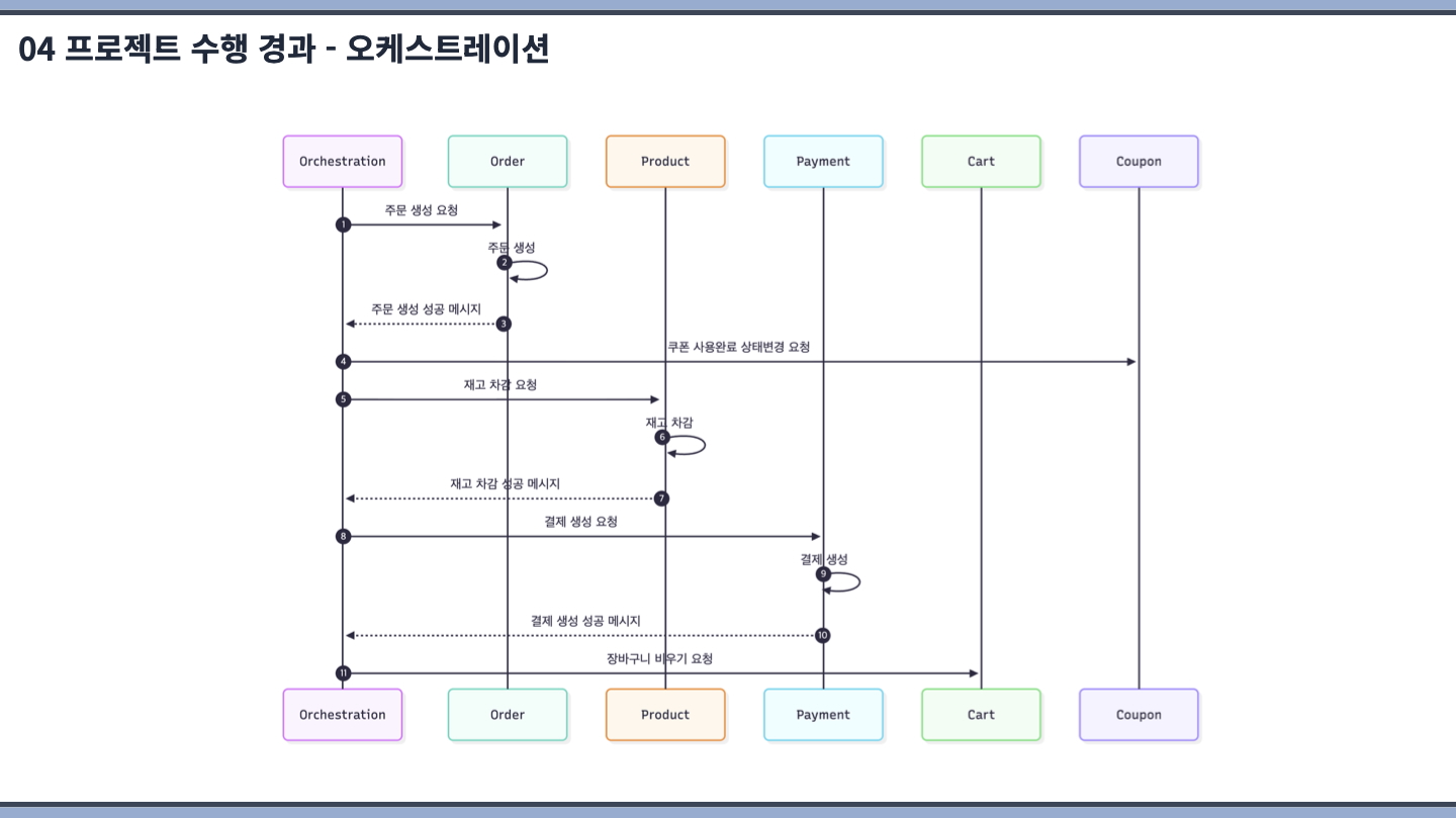 중앙 오케스트레이터 기반의 Saga Orchestration 패턴을 통해 분산 트랜잭션 환경에서 주문 생성, 재고 처리, 결제로 이어지는 복잡한 비즈니스 흐름을 명확하게 제어하였으며, 각 단계의 실패 상황을 중앙에서 일관되게 관리할 수 있도록 설계하였습니다.