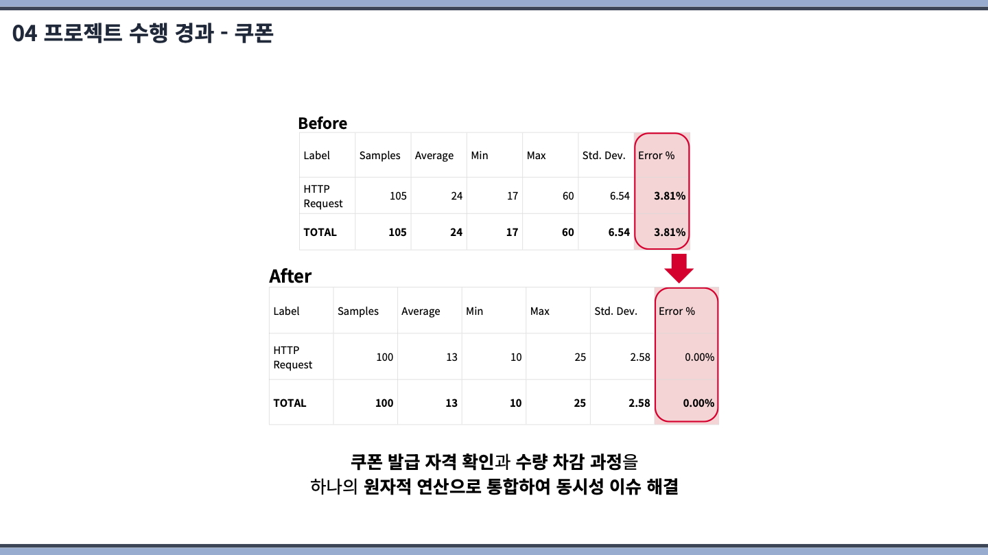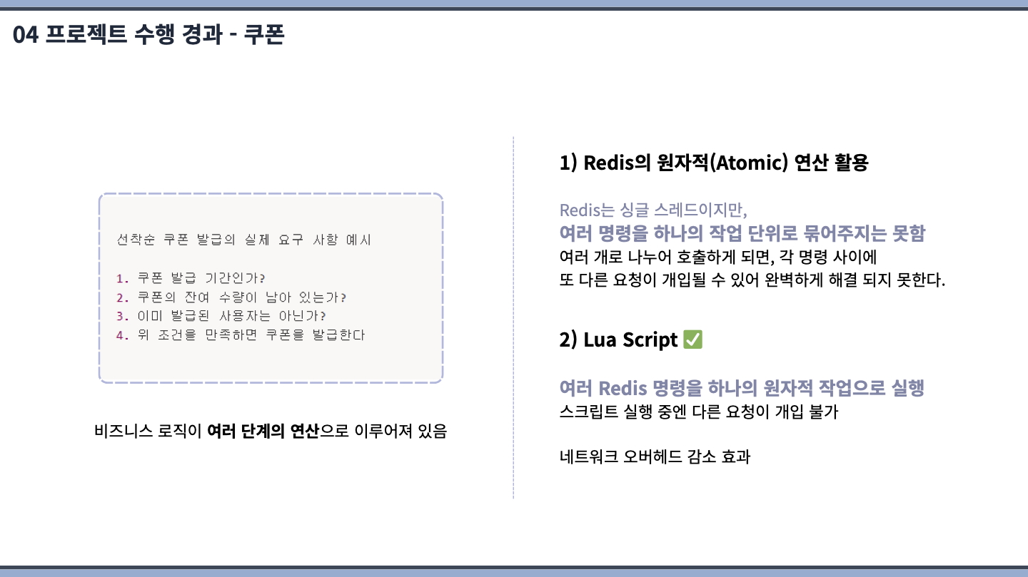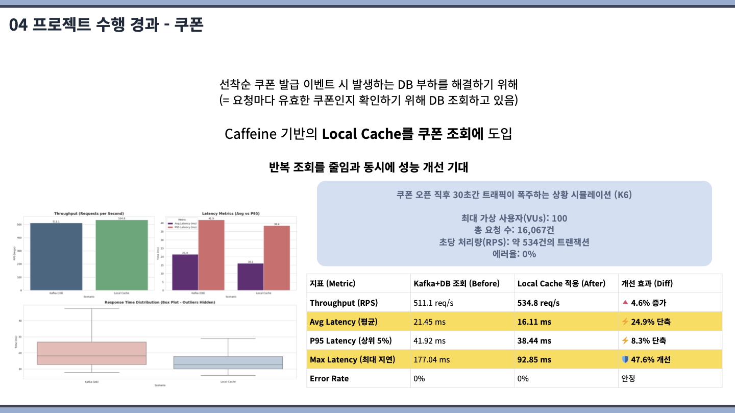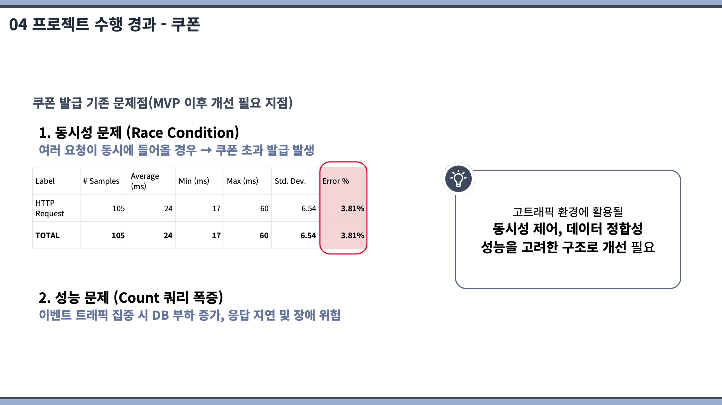 쿠폰 서비스 부분을 맡았습니다. 구현해보고 싶었던 선착순 발급 이벤트를 염두에 두고 구현했기 때문에 대용량 트래픽 환경에서도 데이터 정합성을 보장하도록 신경을 많이 쓴 거 같습니다.