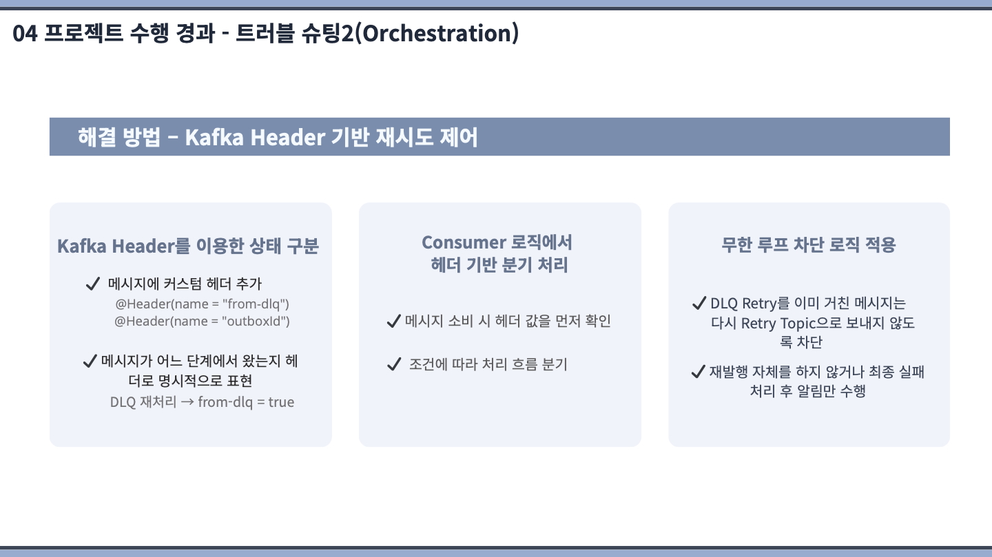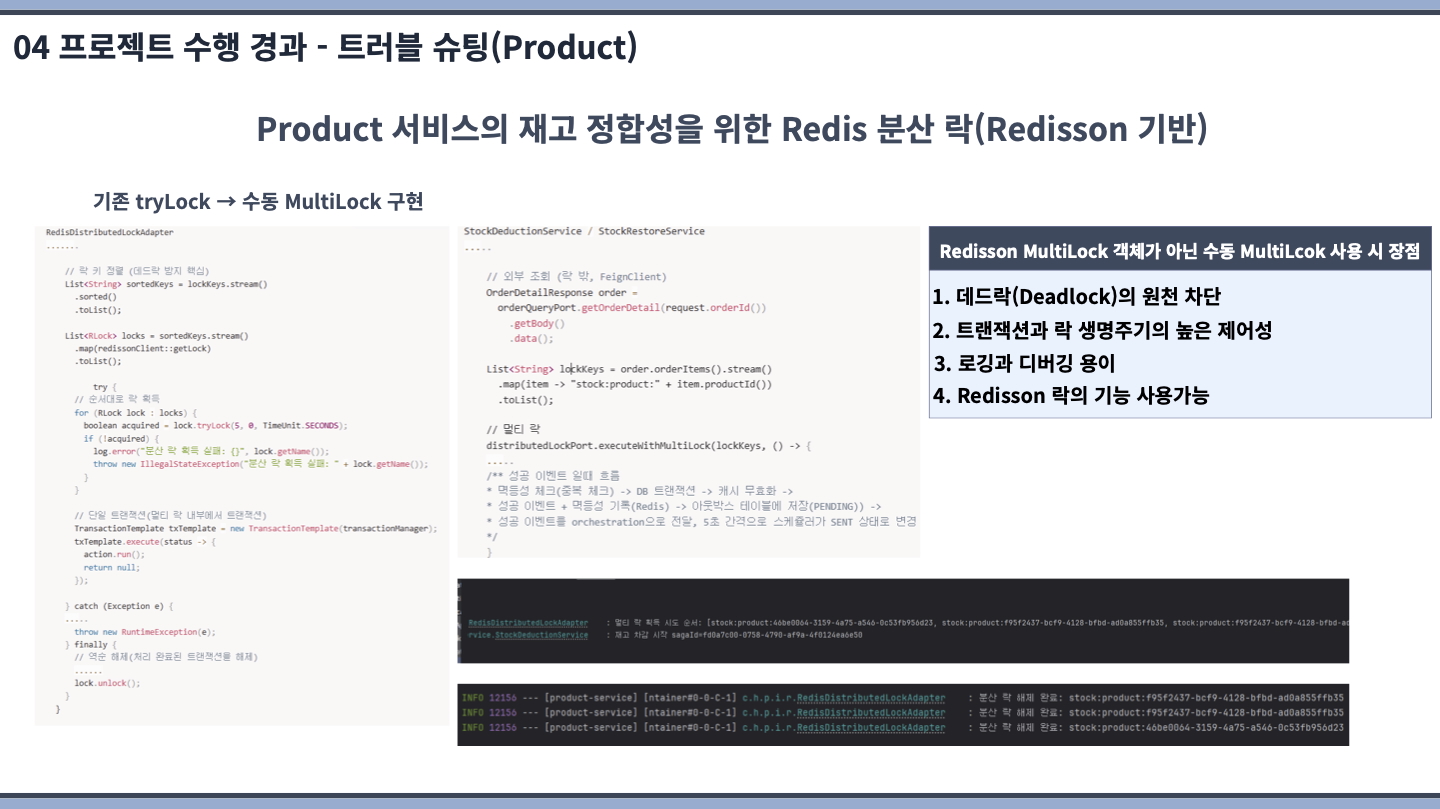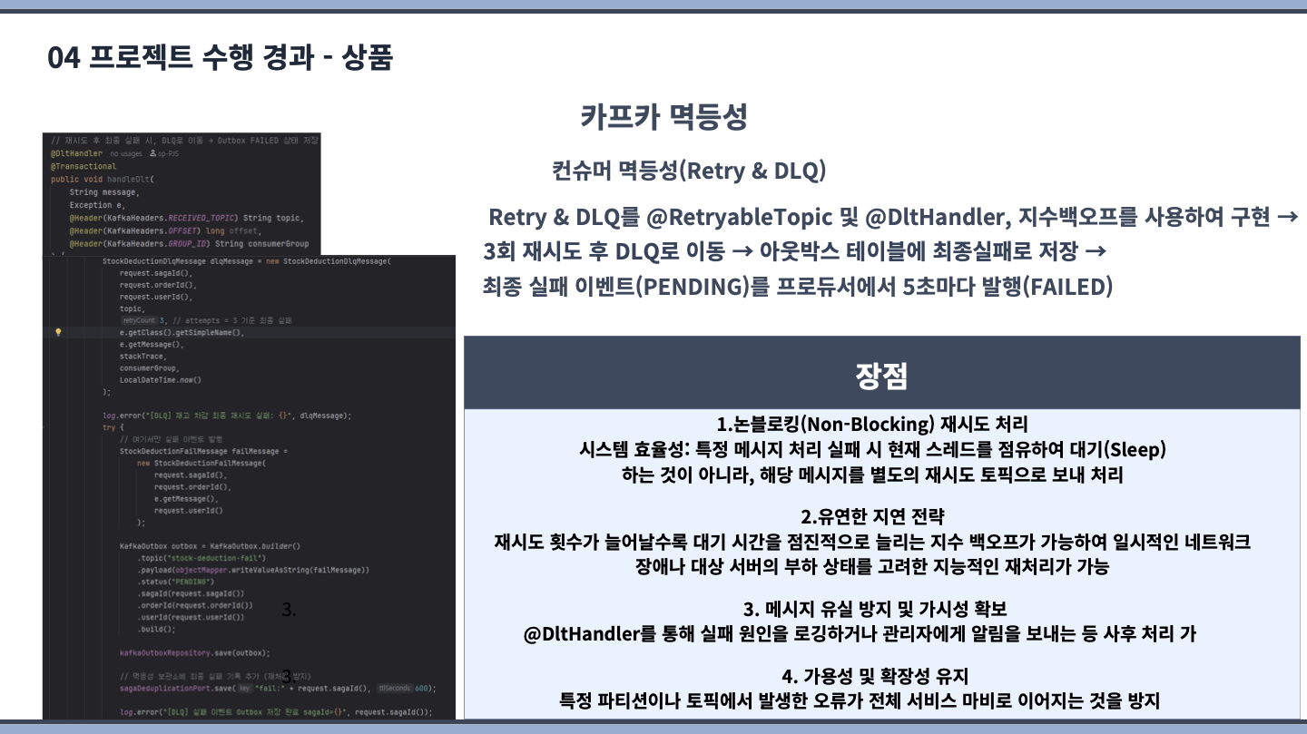 고도화 기간에 컨슈머(Retry & DLQ, Redis를 통한 sagaId 기반 중복체크)/프로듀서의 멱등성 구현(아웃박스 패턴 적용 등) 및 Redisson 기반 수동 멀티 분산 락을 구현하고 테스트까지 제대로 되었을 때 만족스러웠습니다.