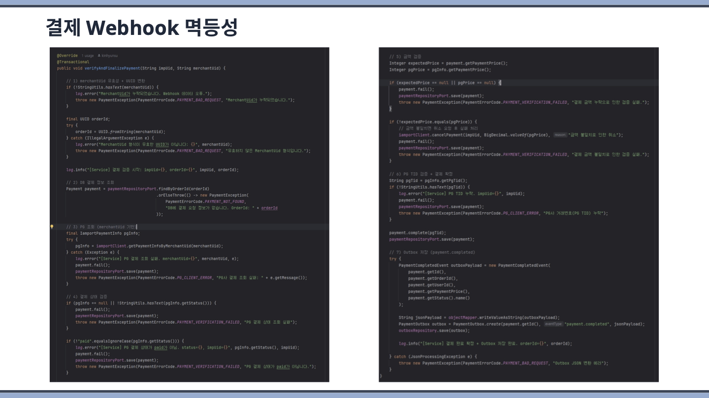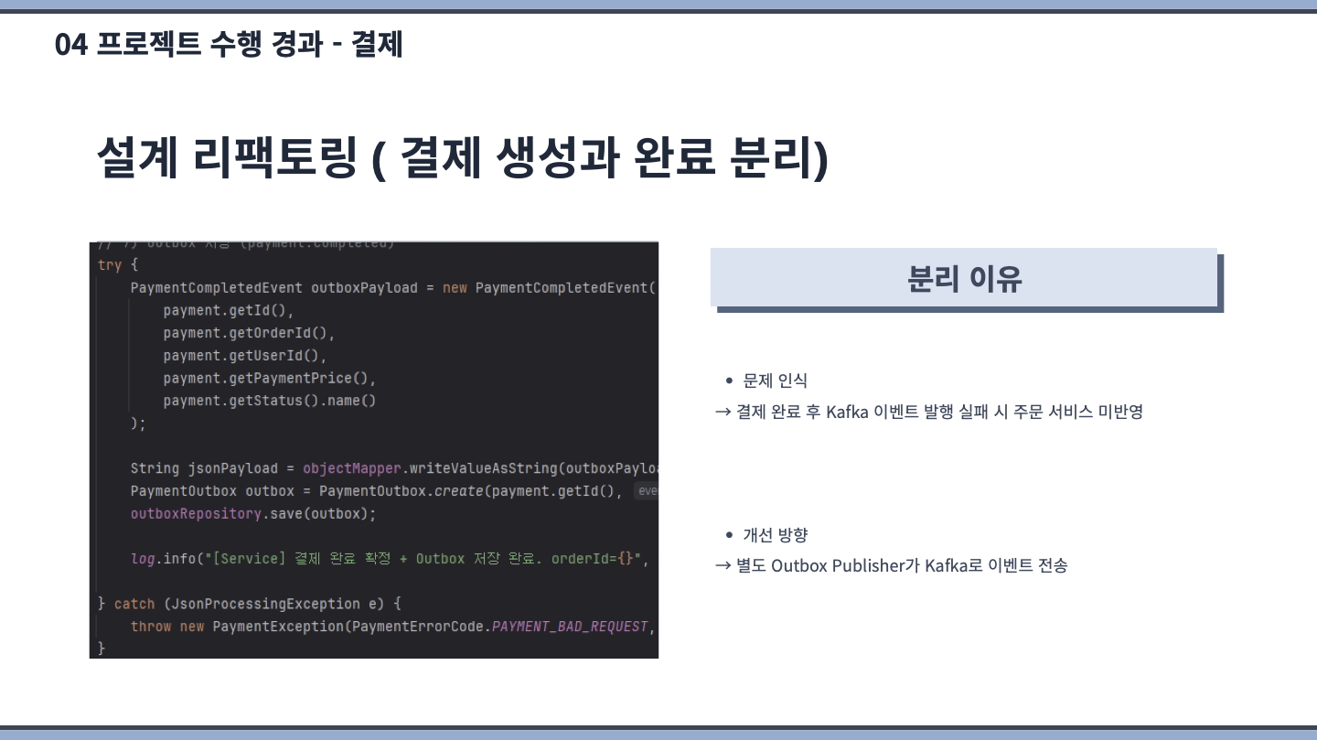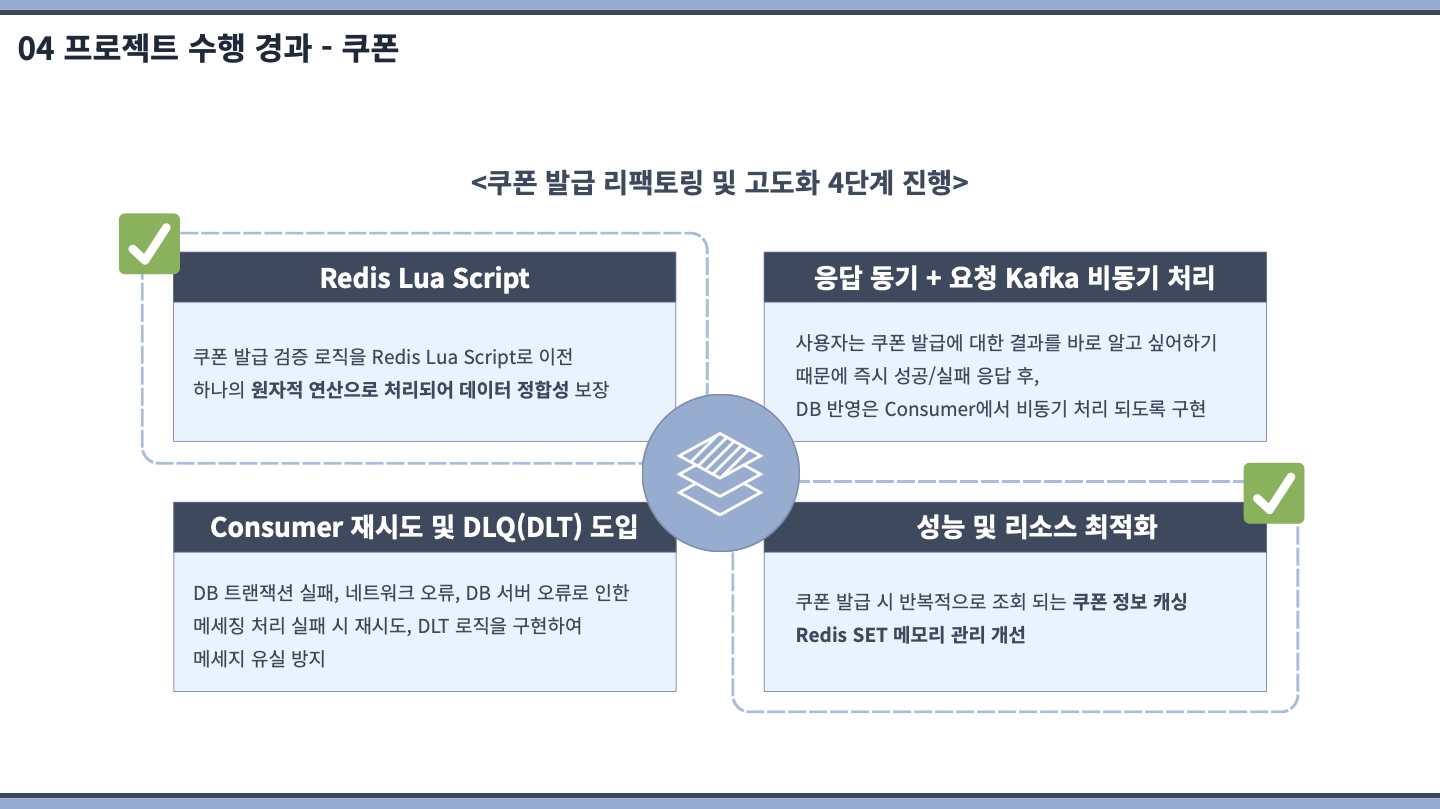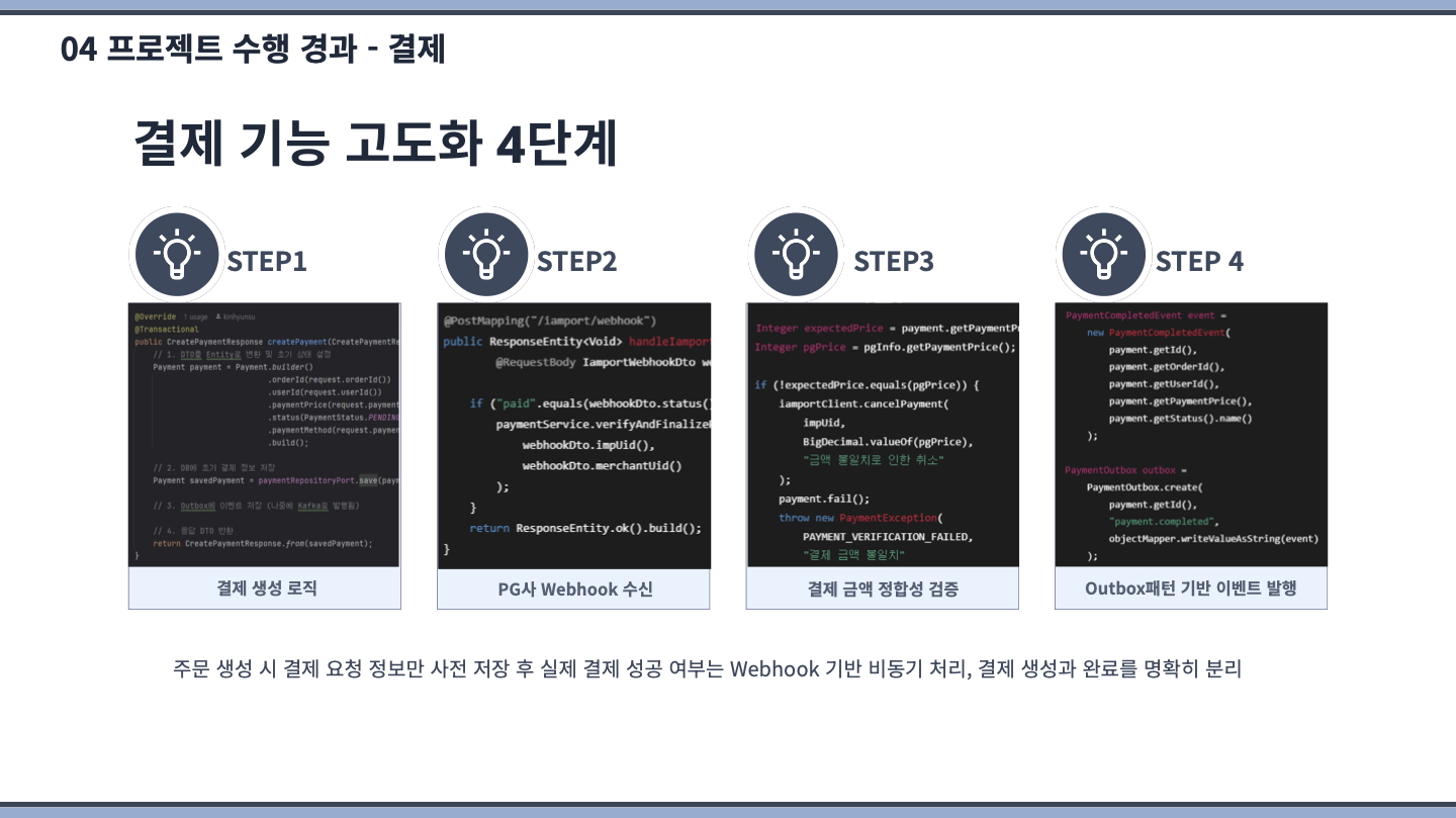 고도화 기간에 컨슈머(Retry & DLQ, Redis를 통한 sagaId 기반 중복체크)/프로듀서의 멱등성 구현(아웃박스 패턴 적용 등) 및 Redisson 기반 수동 멀티 분산 락을 구현하고 테스트까지 제대로 되었을 때 만족스러웠습니다.