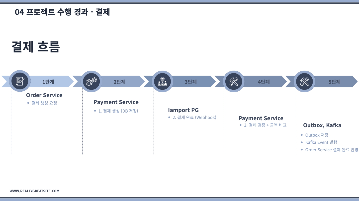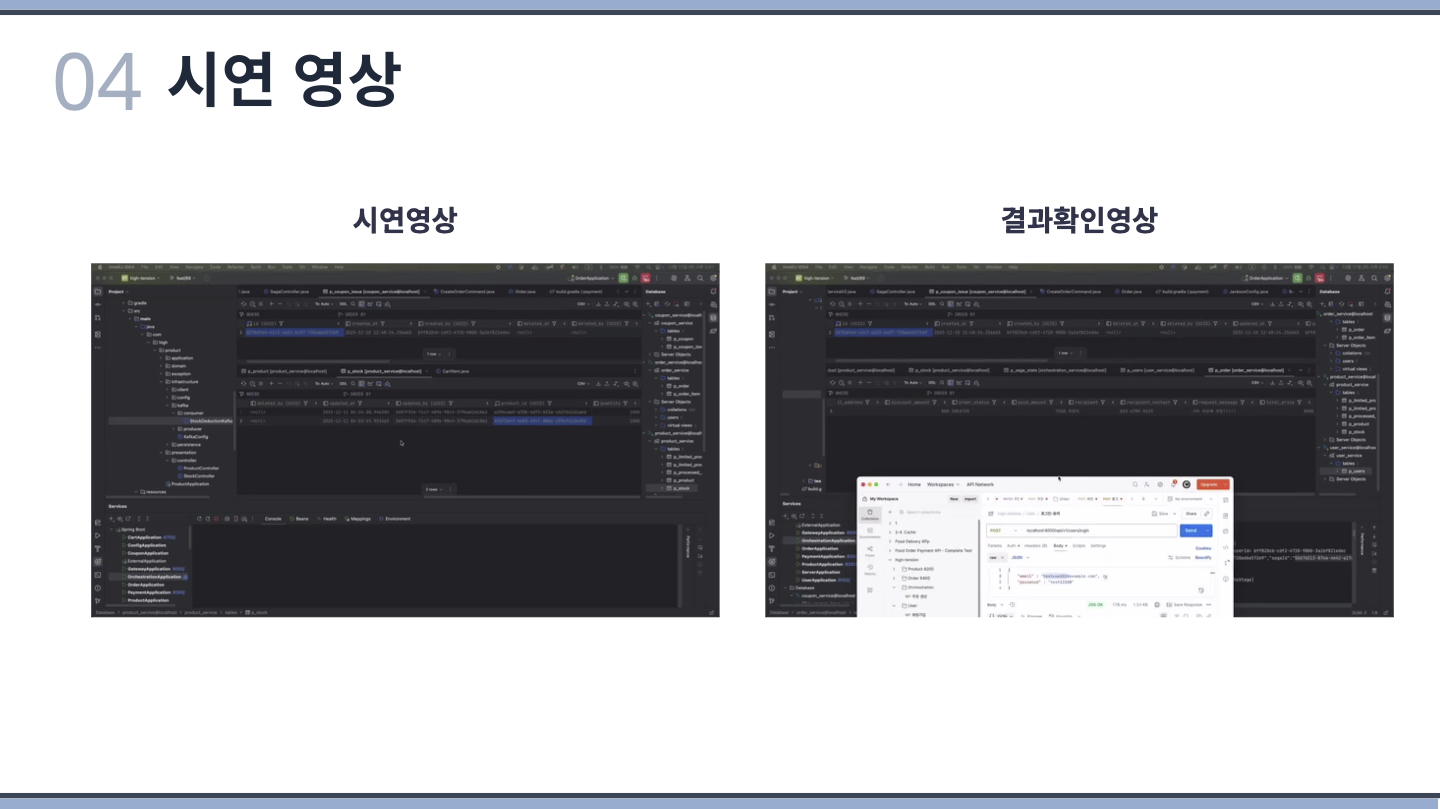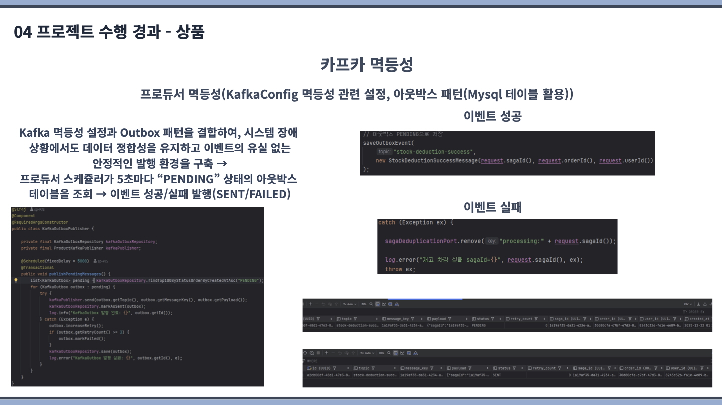상품 개발 역할을 맡았습니다. saga orchestration 기반 이벤트 중앙 집중 처리(재고 차감 / 복원 이벤트) 부분을 가장 집중해서 구현했고 데이터 정합성과 컨슈머, 프로듀서의 멱등성을 지키기 위해 제일 공을 많이 들였습니다.