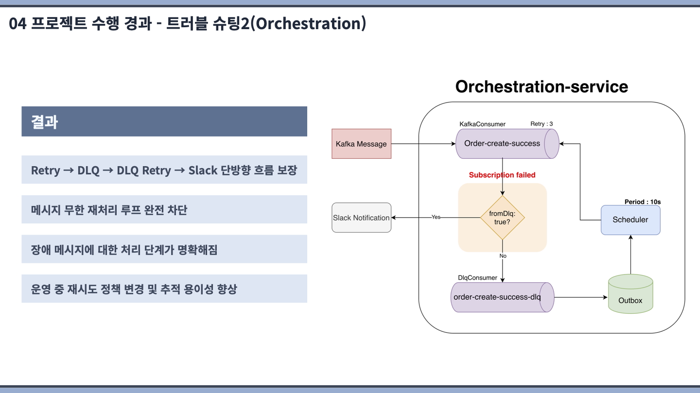 또한 보상 트랜잭션을 통해 중간 단계 실패 시 이전 상태로 안전하게 복구하고, retry 및 DLQ 로직을 적용하여 일시적인 장애와 메시지 처리 실패 상황에서도 주문 데이터의 무결성과 시스템 안정성을 보장하였습니다.