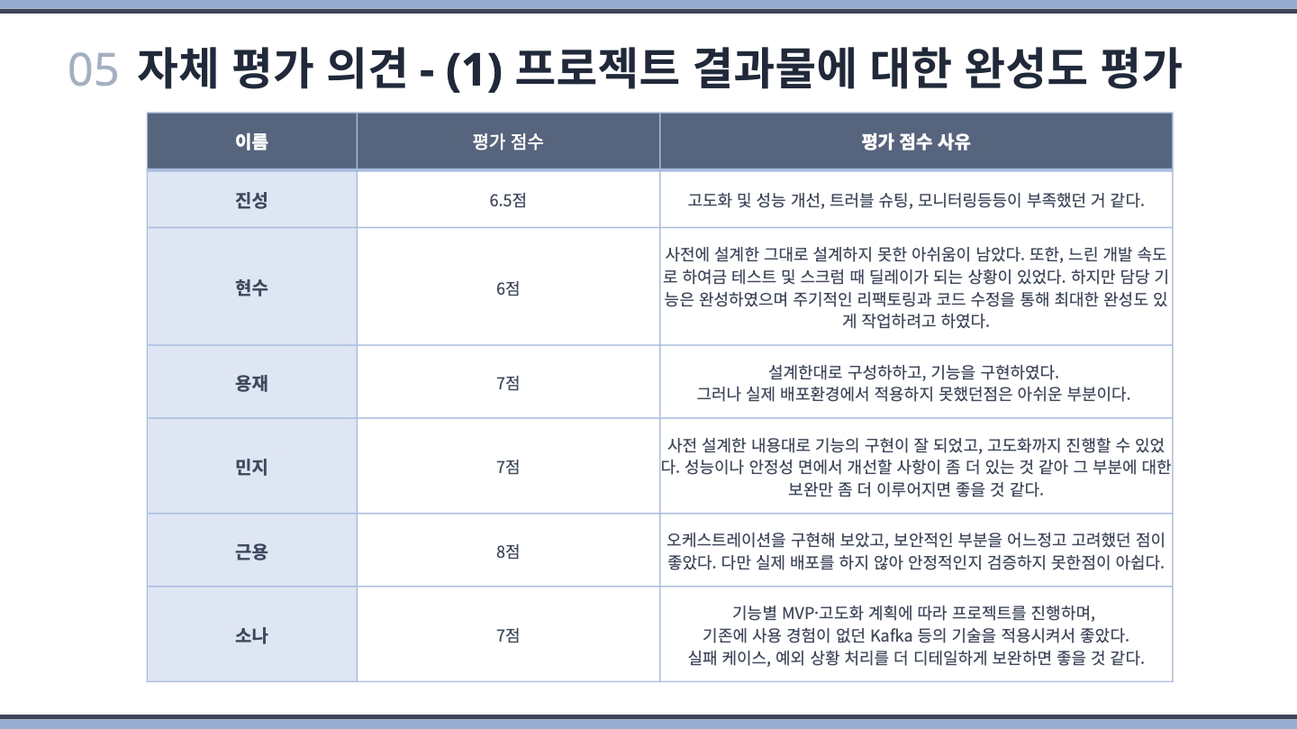 MSA 환경에서 안정성과 데이터 무결성을 보장하기 위하여 설계 단계부터 고민이 많았습니다. 이러한 과정에서 오케스트레이션이나 kafka, dlq등 새로 접하게 된 개념이나 기술이 많았는데, 끊임없이 학습하고 고민하여 적합한 방법을 찾아내고, 초반에 설계한 대로 기능 구현 잘된 점이 가장 만족스럽고 기뻤습니다.
