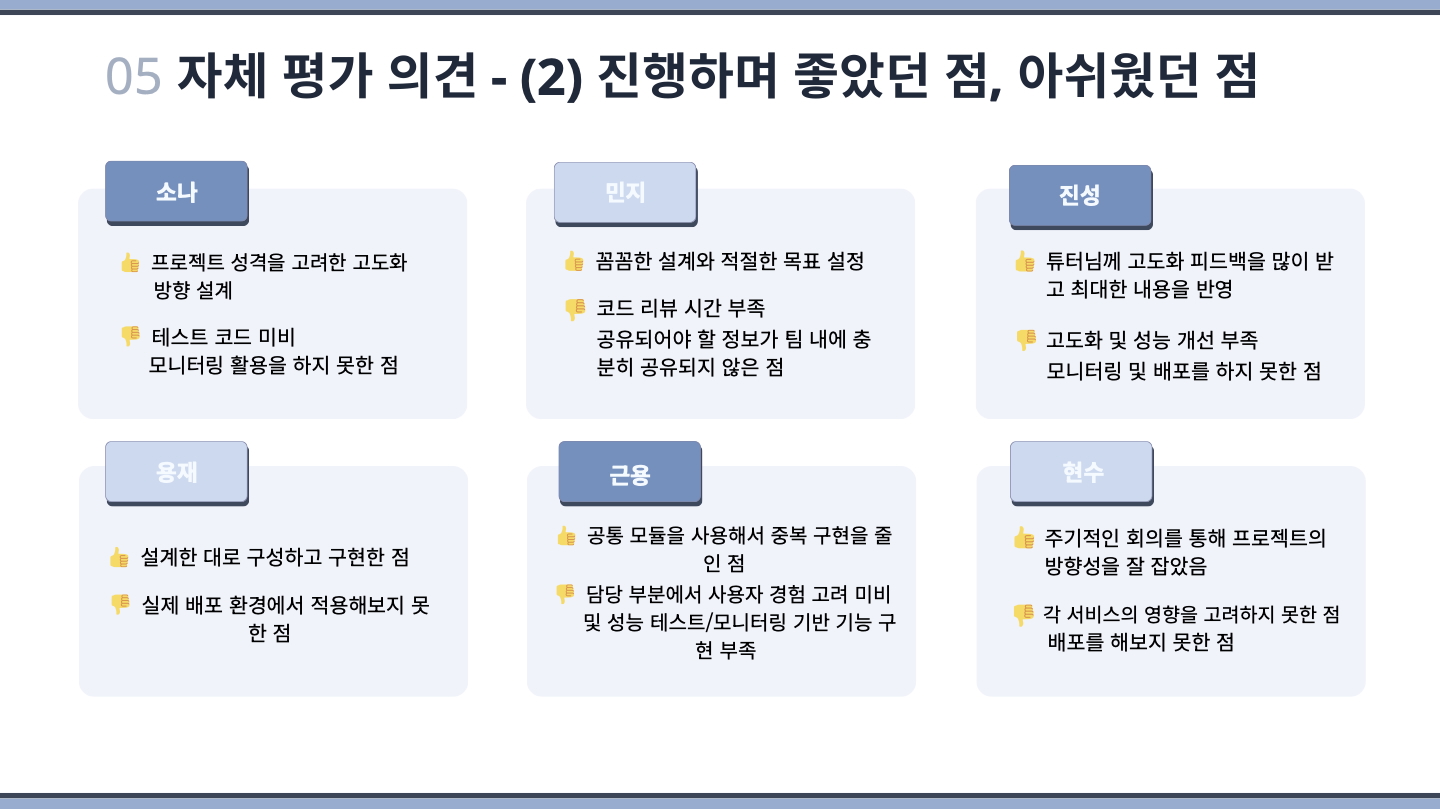 이 프로젝트를 함께한 팀원들 모두 새로운 기술을 익히고 적용하는 과정에서 쉽지 않은 순간들이 많았을 텐데, 그럼에도 서로 도우며 끝까지 포기하지 않고 완성해줘서 진심으로 고맙다는 말을 전하고 싶습니다. 팀원들의 노력이 프로젝트에 잘 담겨 전달되었다는 의미 같아서 이 상이 더 뜻깊고 뿌듯하게 느껴집니다. 감사합니다.