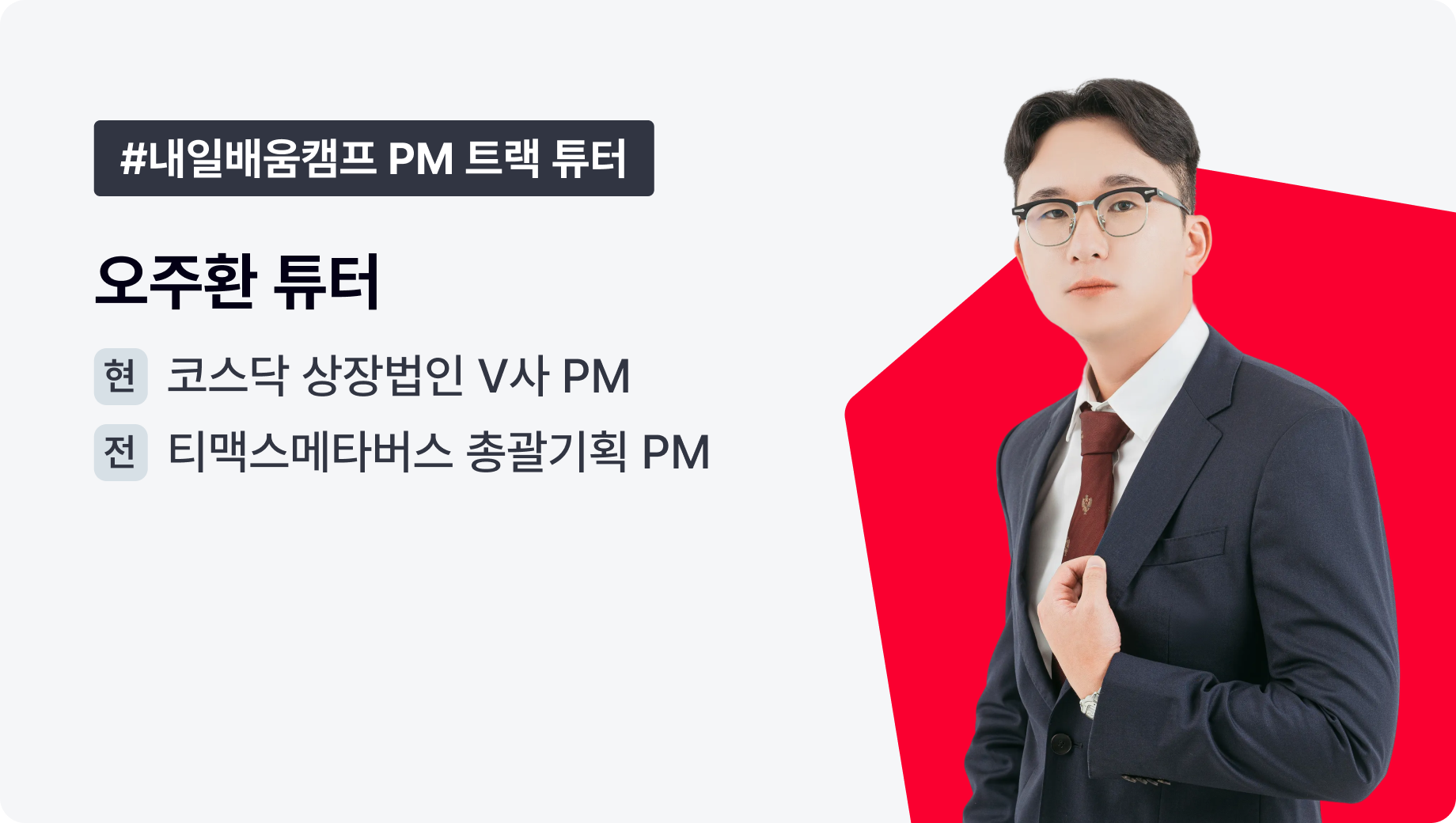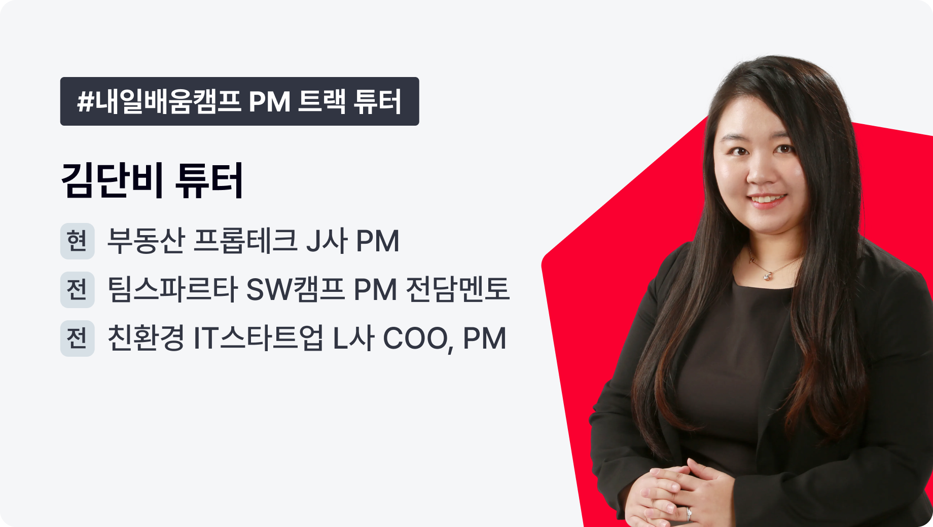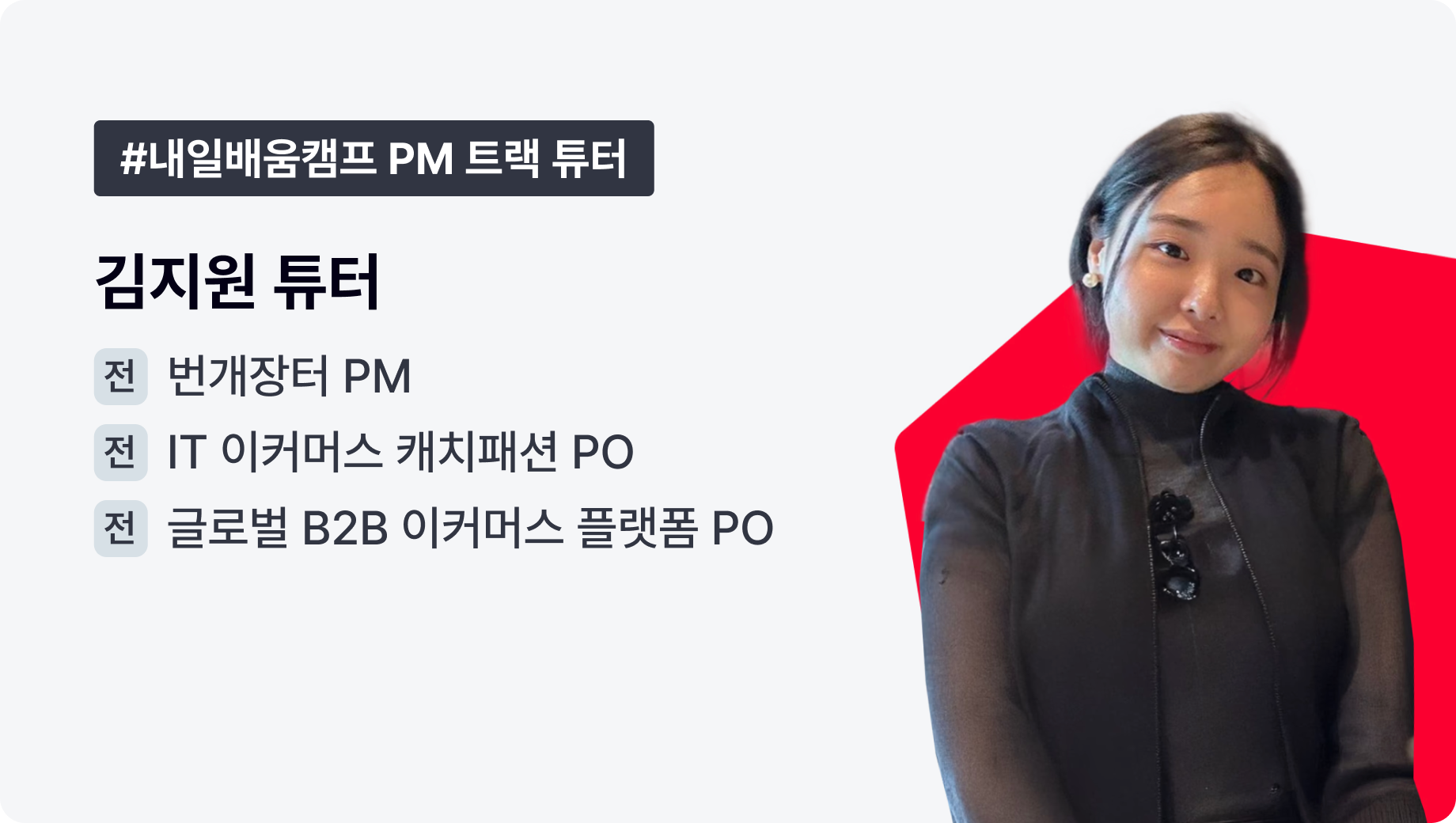 PM 트랙에서 김지원 튜터님은, 기획을 성과로 증명해 보고 싶은 수강생에게 한 단계 높은 기준을 보여 주는 튜터입니다. 실무에서 검증된 판단과 관점을 가까이에서 경험해 보고 싶다면, 충분히 기대해 보셔도 좋겠습니다.