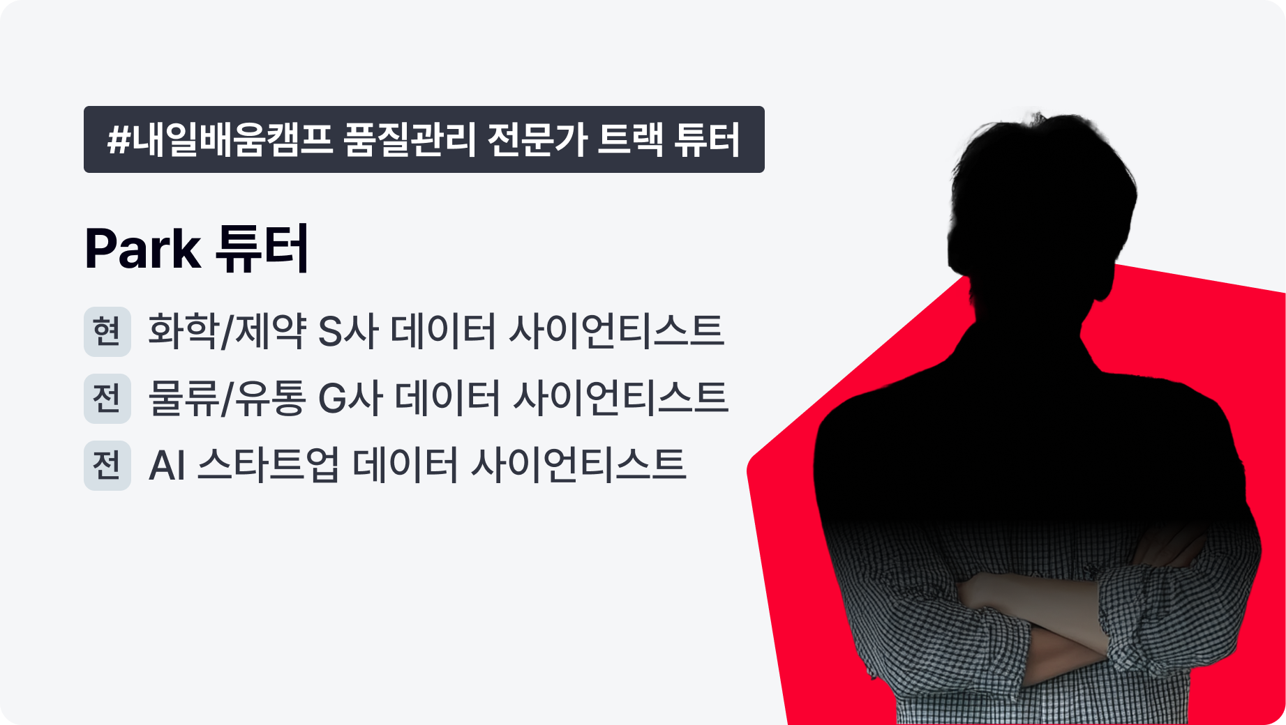 Park 튜터님은 제조, 유통 환경에서 데이터 분석과 품질 관리를 함께 경험해 온 QAQC 분석가입니다. 실제 서비스와 운영 데이터가 생성되는 현장에서, 데이터의 신뢰도와 활용 가능성을 기준으로 분석과 검증 업무를 수행해 왔습니다.