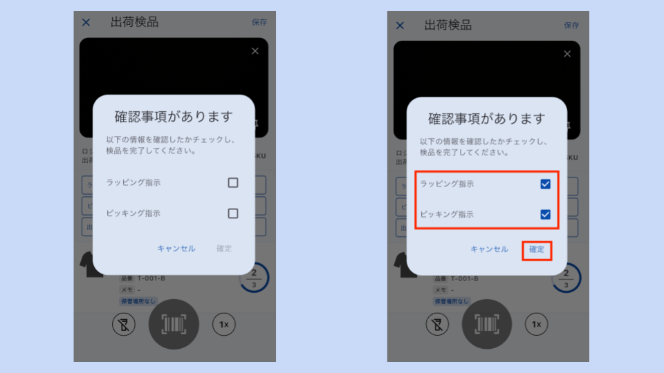 未確認の場合は「キャンセル」をタップし検品画面に戻り、ギフト指示、ピッキング指示を確認