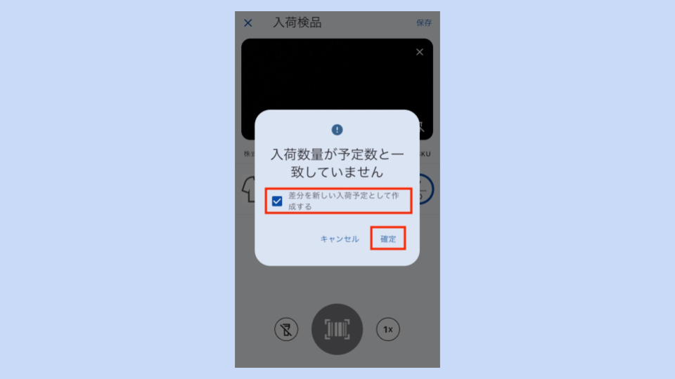 入荷予定数に対し検品数が満たない場合、保存をするとインフォメーションモーダルが表示し、「差分を新しい入荷予定として作成する」かどうかを選択できます。