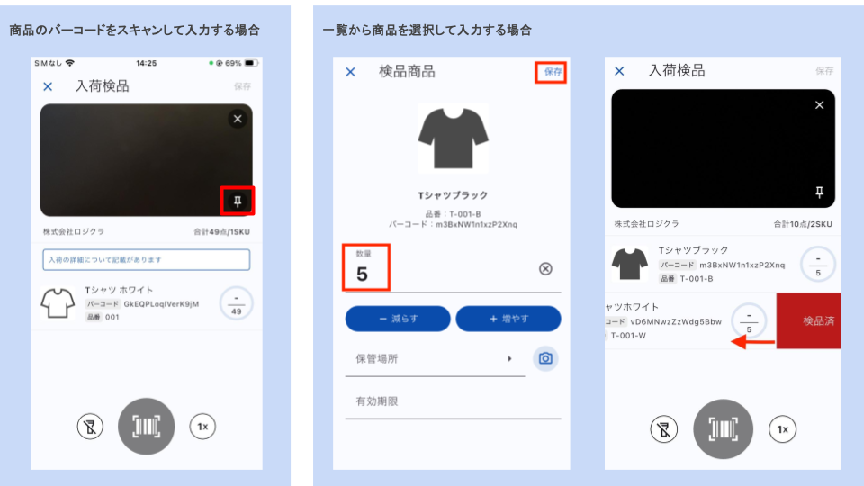 検品時に、「一覧から商品を選択して入力する場合」で進めた場合、数量入力と同時に保管場所の選択も可能です