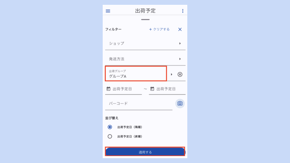 フィルターを利用して、作業を行う出荷グループの出荷予定のみ一覧に表示できます。