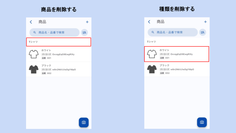 商品、種類、どちらを削除するかでタップする箇所が異なります。