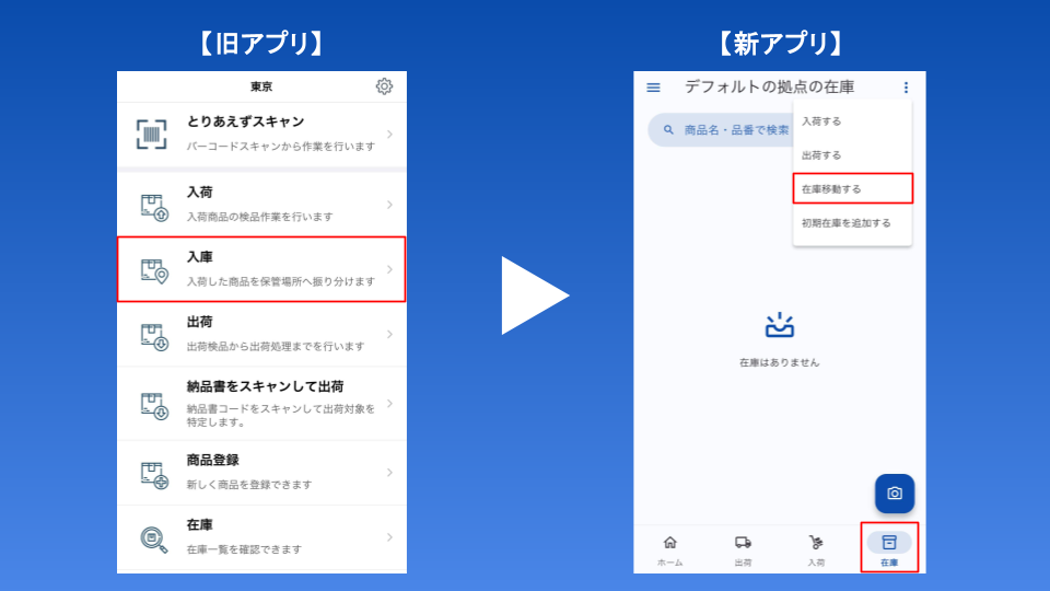 入庫は在庫メニュー統合され「在庫移動する」という項目に変更しました