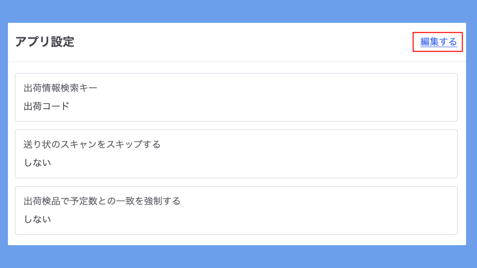 操作手順設定 > 会社情報 > アプリ設定 編集する をクリック設定項目項目備考出荷情報検索キー出荷検品時に読み取る帳票の検索キー▶ 詳細はこちら送り状のスキャンをスキップする出荷確定時の送り状スキャンの制御出荷検品で予定数との一致を強制する出荷検品時の制御