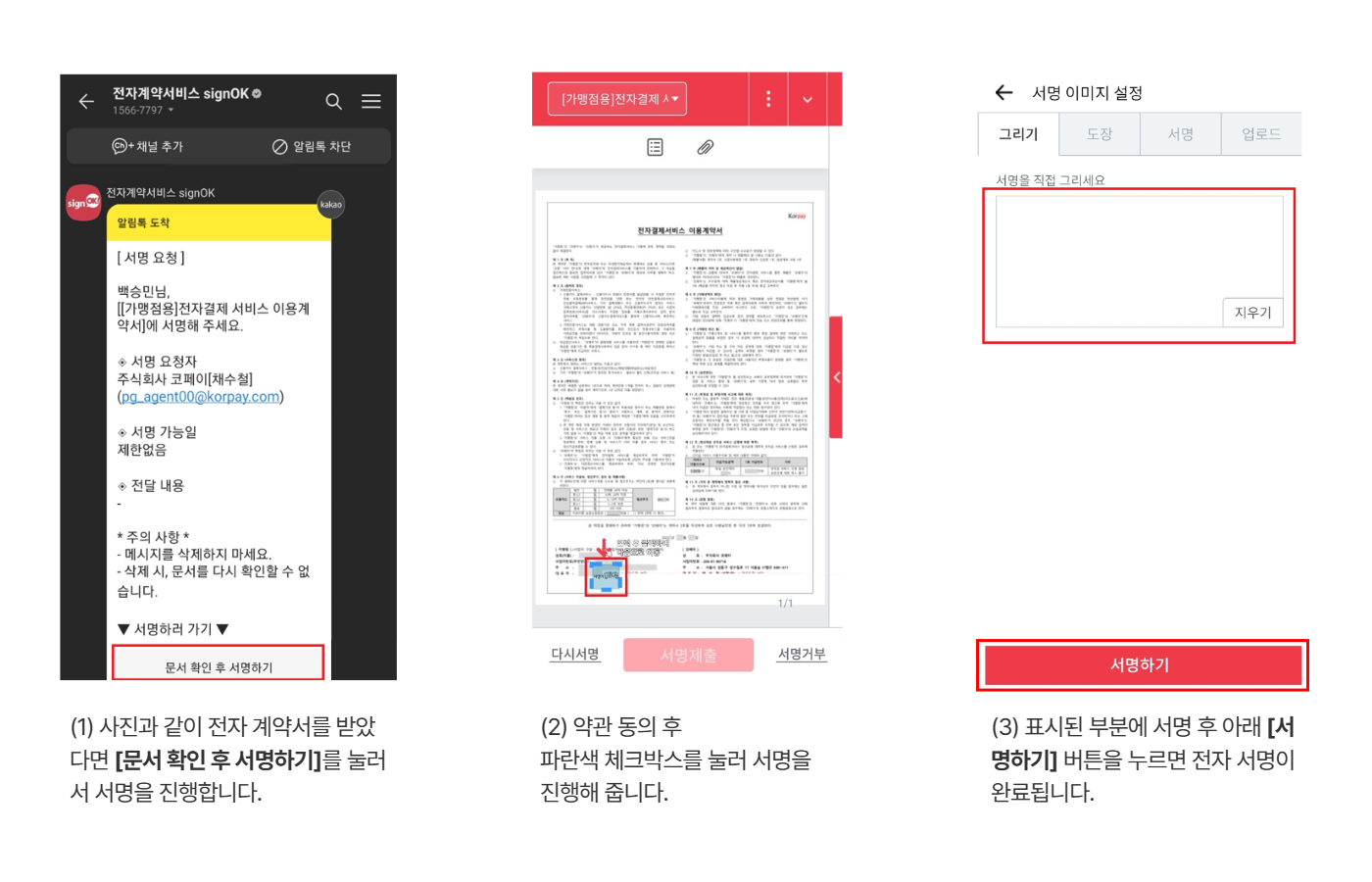 ③ 화면에 표시된 칸에 손글씨로 서명하고 [서명하기] 버튼을 눌러 제출하면 완료!