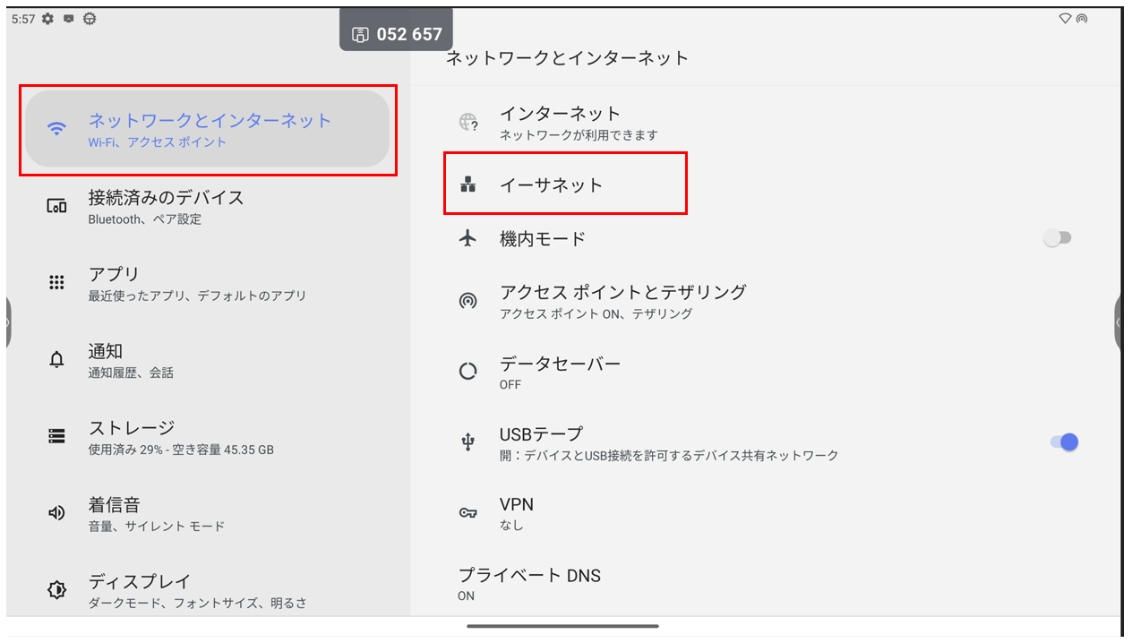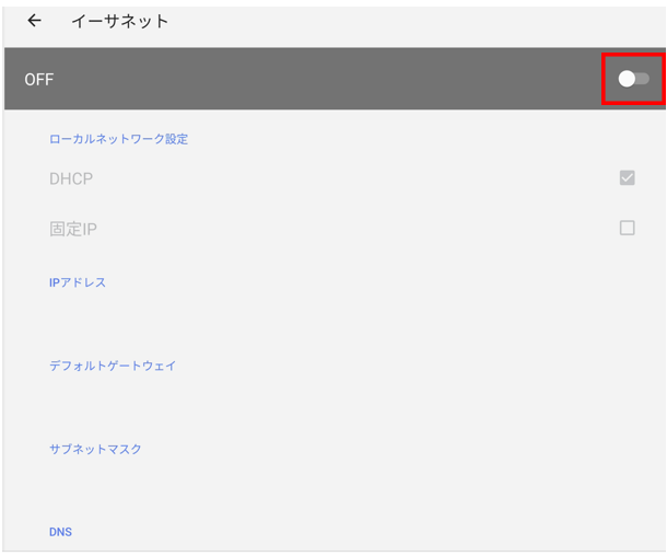 有線ネットワークの接続①本機下部にある有線LAN端子にLANケーブルを接続してください。②ホーム画面の「全てのアプリ」から「設定」を選択③「ネットワークとインターネット」から「イーサネット」を選択④「イーサネット」をオンにする