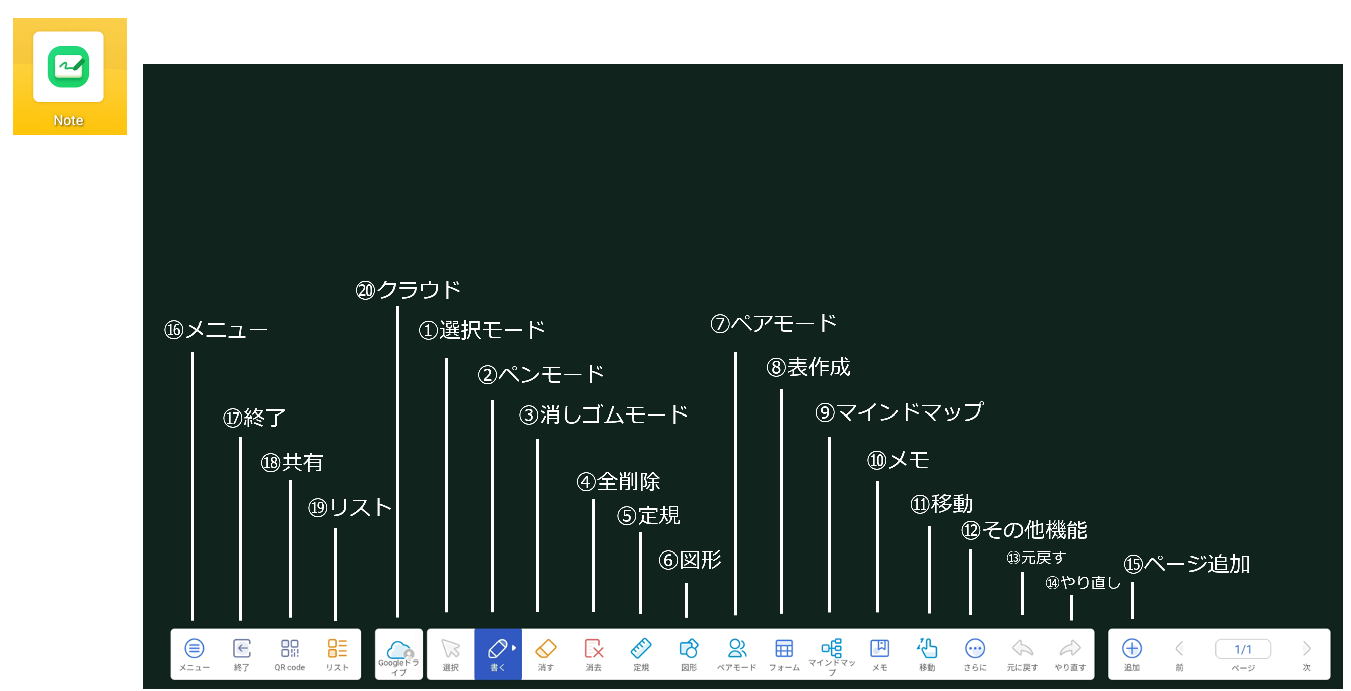 NoteアプリはMAXHUBオリジナルのホワイトボードアプリです。ホーム画面のNoteアプリで起動し、書く・消す等の基本的な機能の他にも、さまざまな機能をご使用できます。
