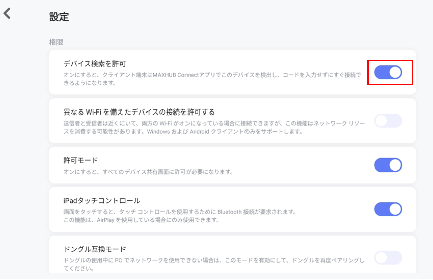 1)本機のMAXHUB Connectを起動し、「メニュー」→「設定」を選択し、「デバイス検索を許可」をオンにします。