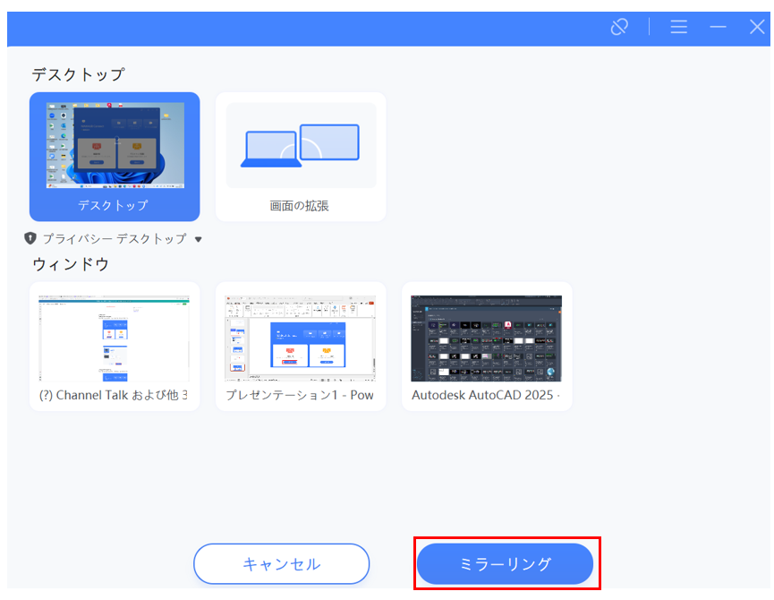 本機との接続後、画面共有の「始める」→「ミラーリング」を選択すると画面投影が開始されます。