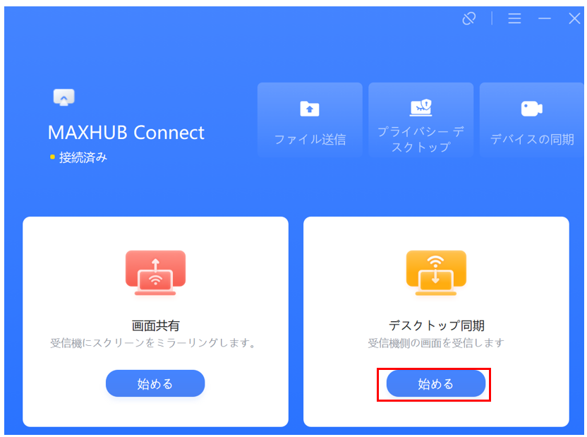 本機との接続後、デスクトップ同期の「始める」を選択すると画面投影が開始されます。