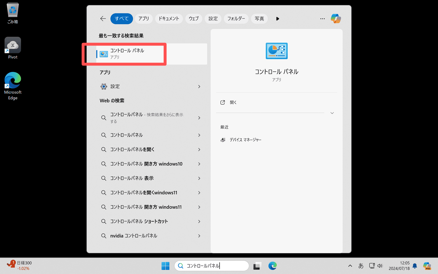 Windows画面下部の検索欄からコントロールパネルを検索し、コントロールパネルを表示させます。
