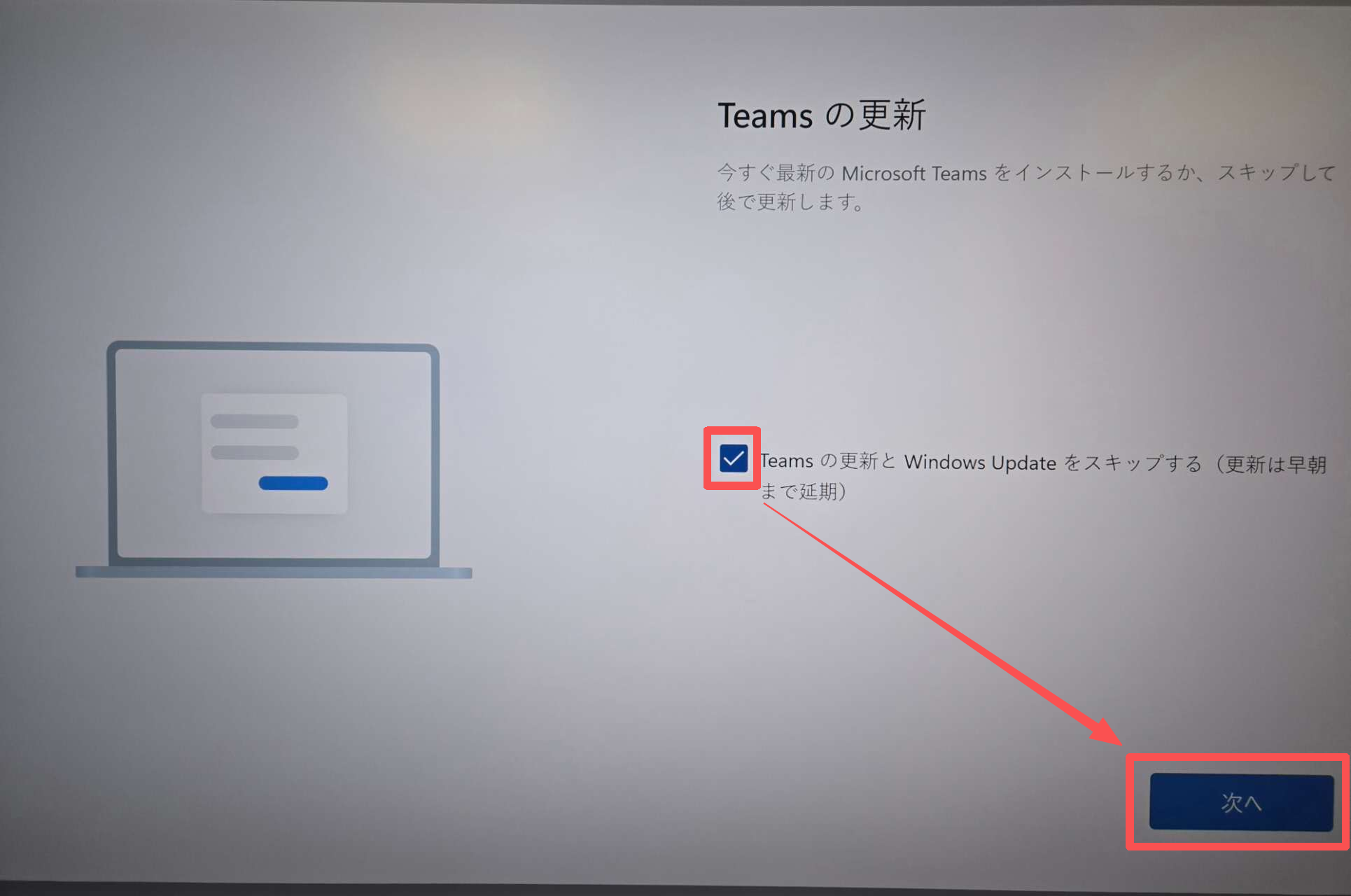 [Teams の更新とWindows Updateをスキップする(更新は早朝まで延期)]にチェックを入れて [次へ]を選択してください。