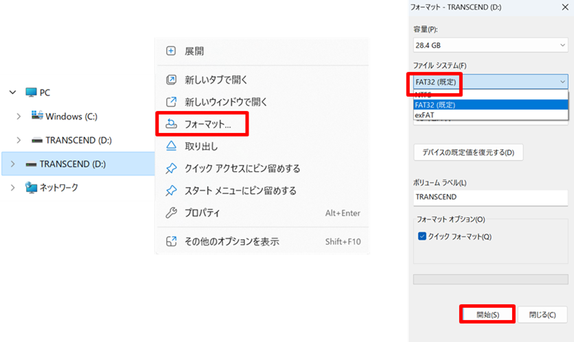 ファイルシステム 「FAT32」を選んでいることを確認し、「開始」を選択