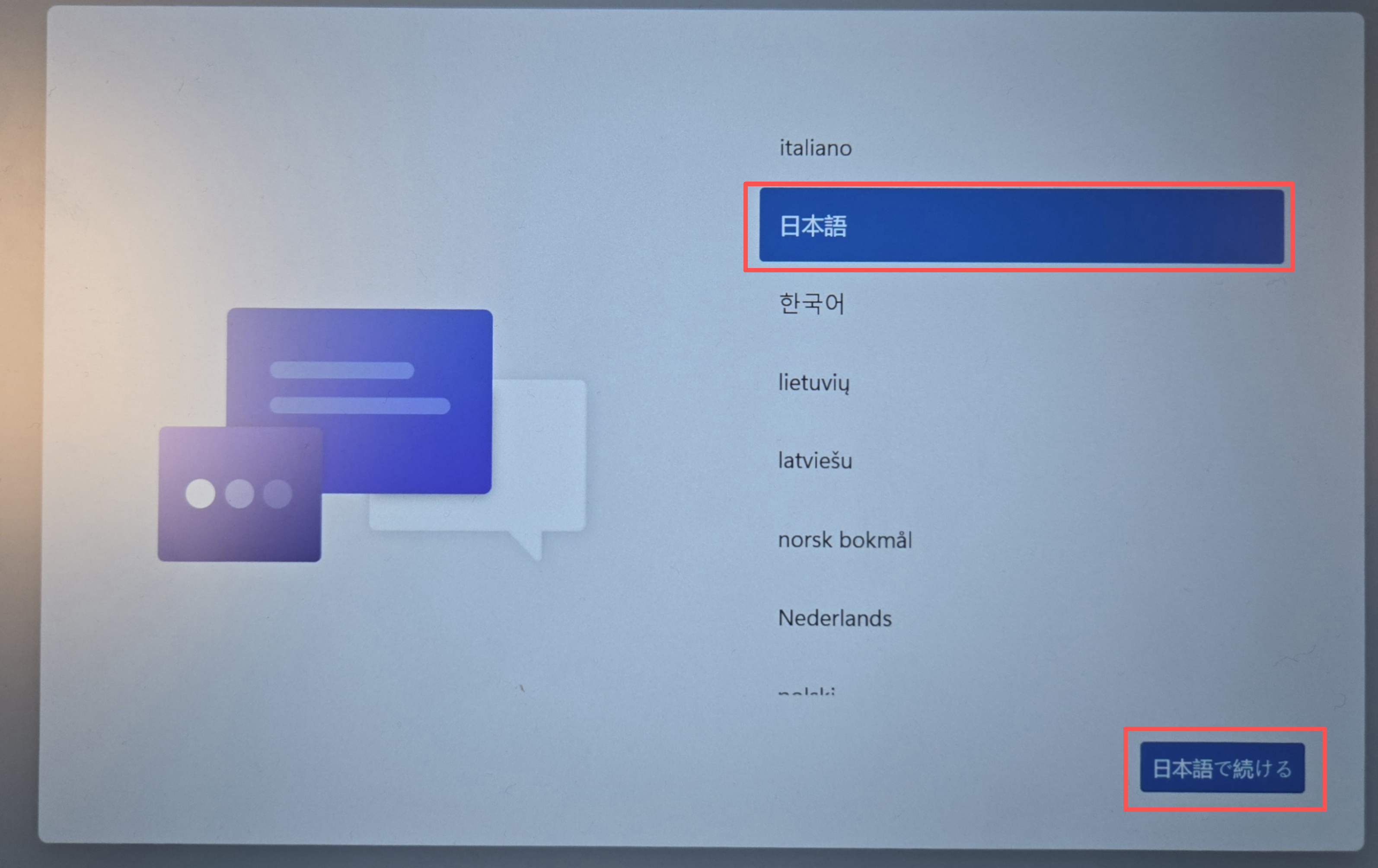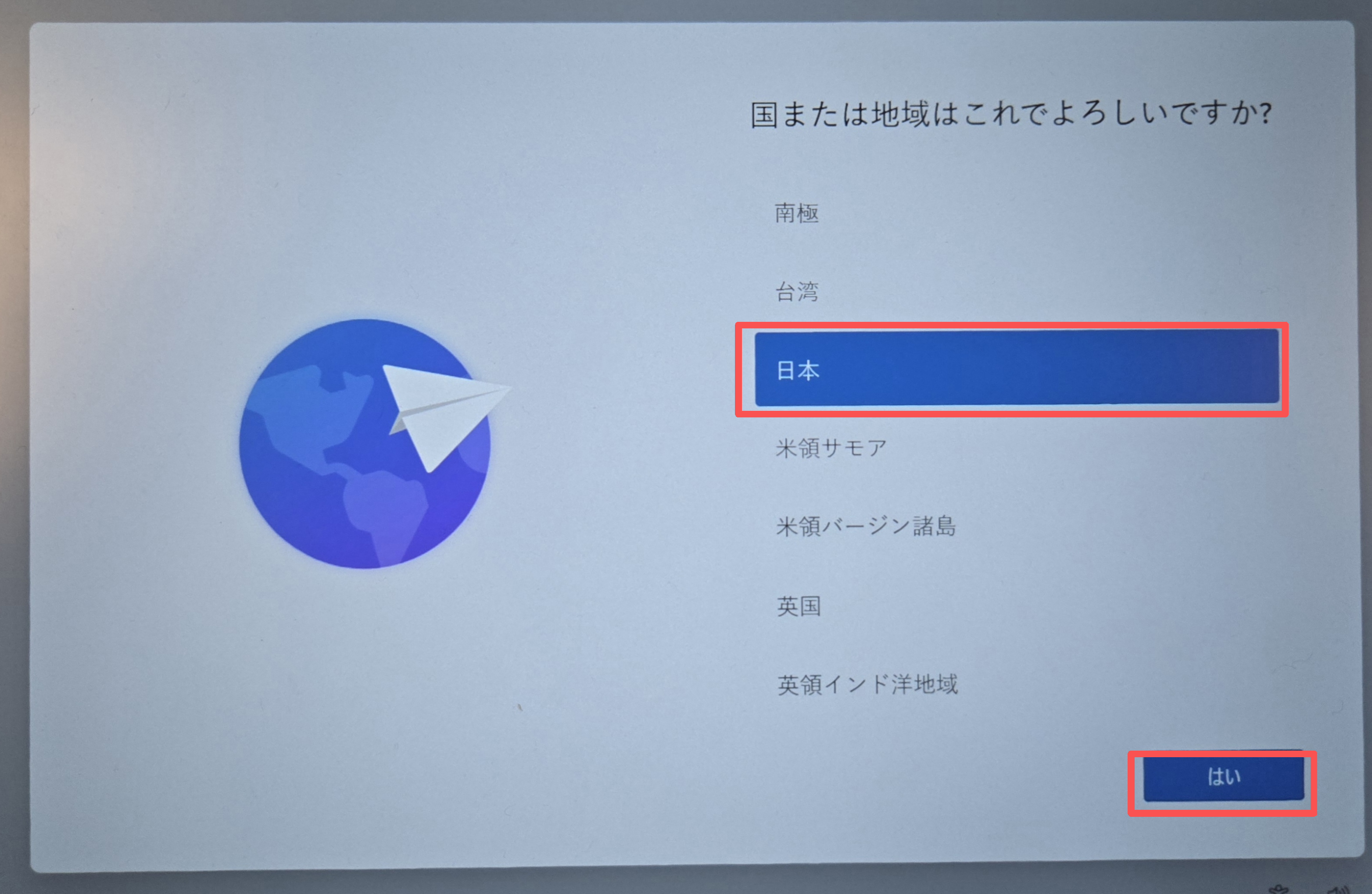 電源をONにして約5分後、初期設定画面(OOBE)が開始します。