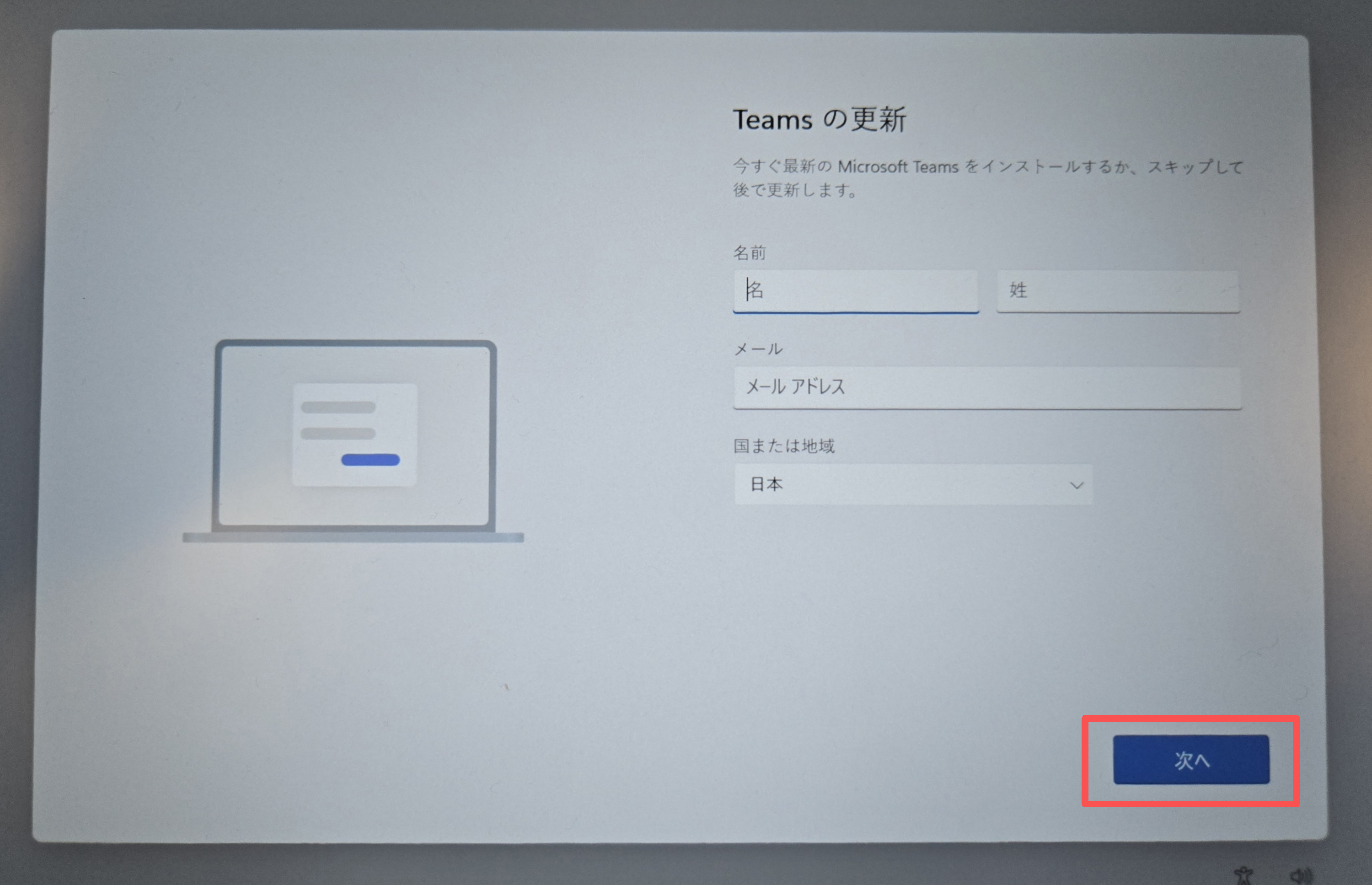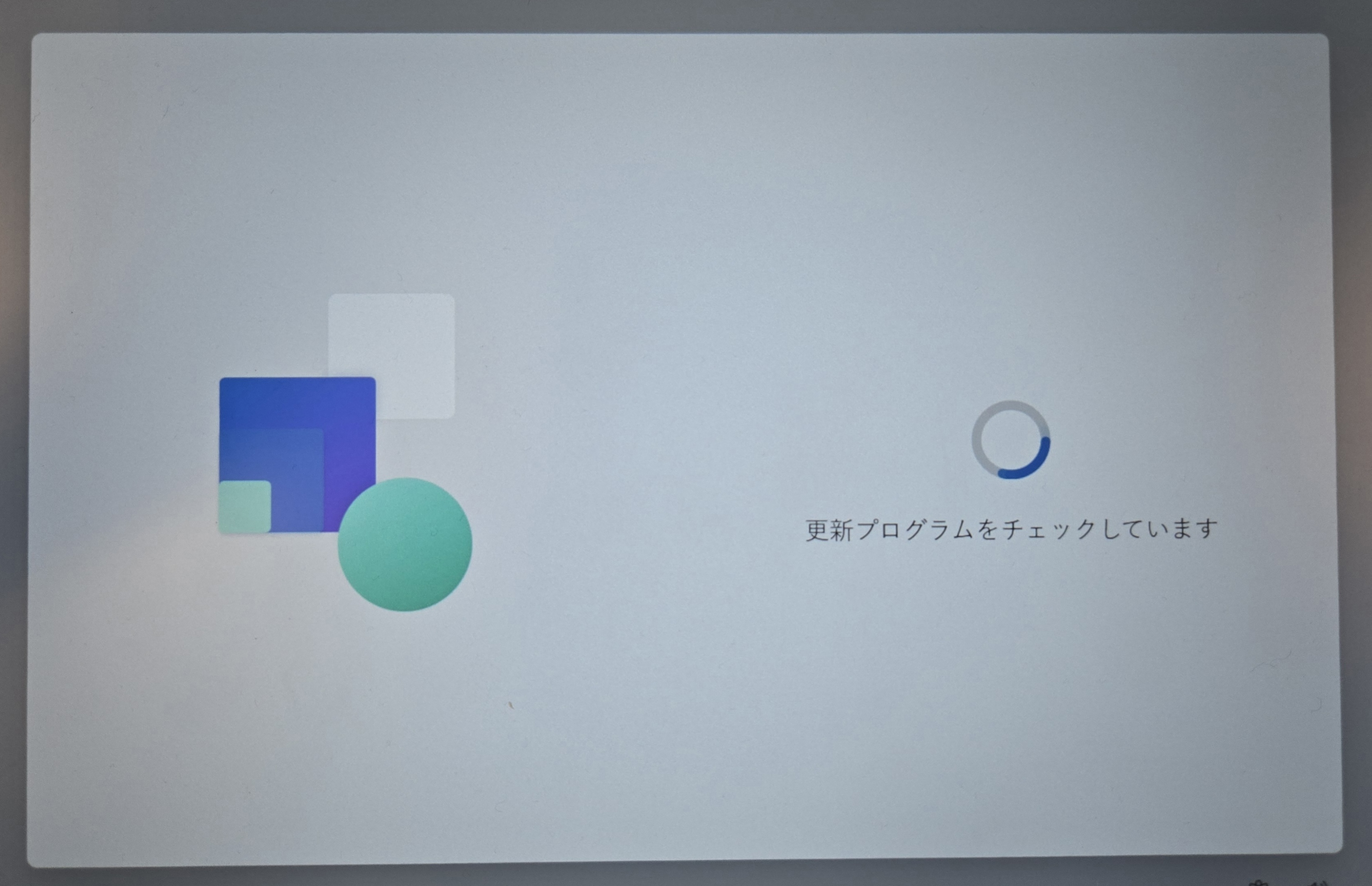 キーボード レイアウトとインターネットの接続設定が完了すると、[更新プログラムをチェックしています] と表示され、約5分後に Teams の更新 画面が表示されます。