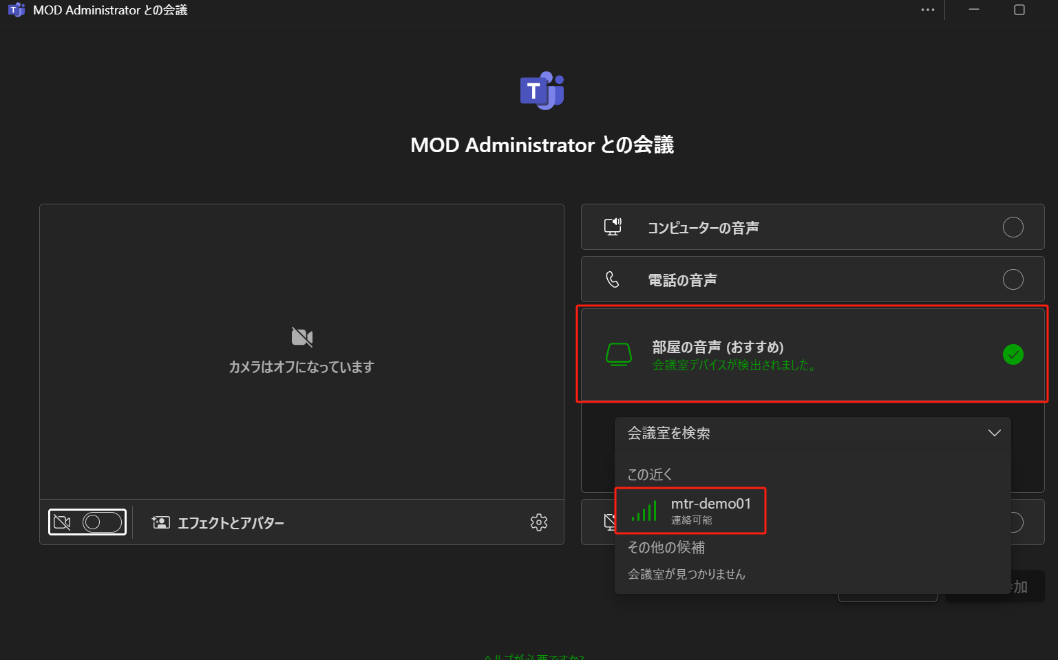 会議参加時に「部屋の音声(おすすめ)」を選択し、付近のMicrosoft Teams Roomsデバイスを選択します。