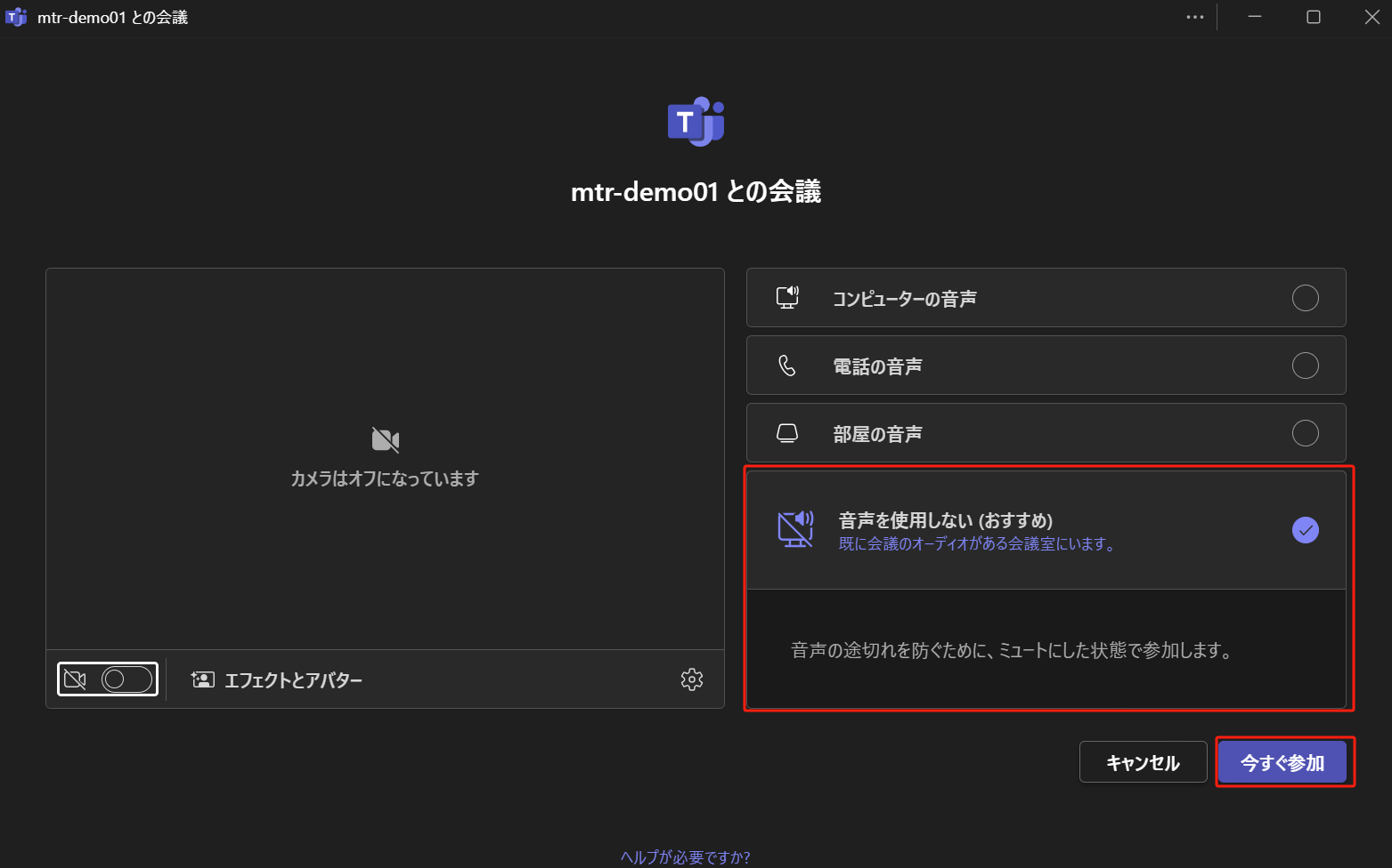 会議参加時に「音声を使用しない(おすすめ)」を選択します。