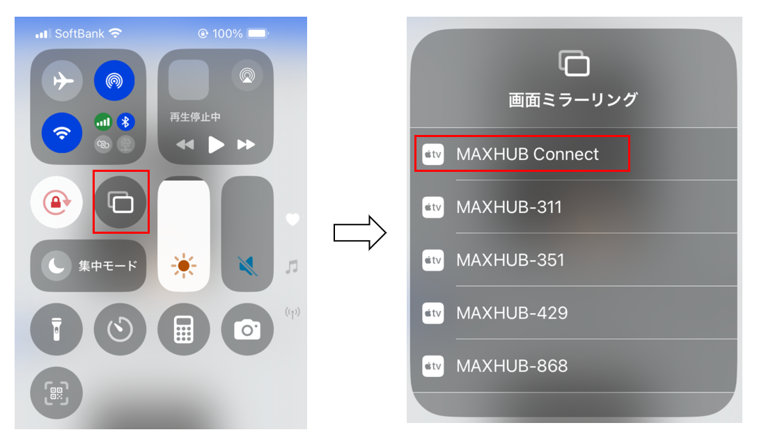 スマートフォンをスワイプし、コントロールセンターを開き、ミラーリングからMAXHUB Connectを選択すると画面投影が開始されます。