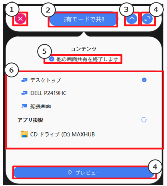 占有モード:ONにして画面投影をすると、他の画面投影を終了できます。OFFにして画面投影をすると、複数端末での画面投影ができます。