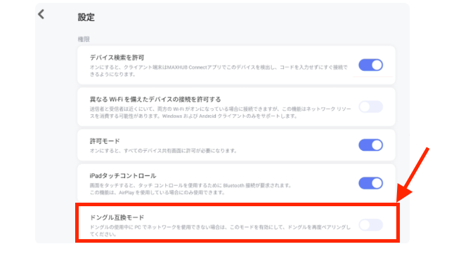 U30内の「MAXHUB Connect」アプリより、設定から「ドングル互換モード」をオンにしてください。