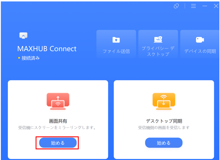 本機との接続後、デスクトップ同期の「始める」を選択すると画面投影が開始されます。
