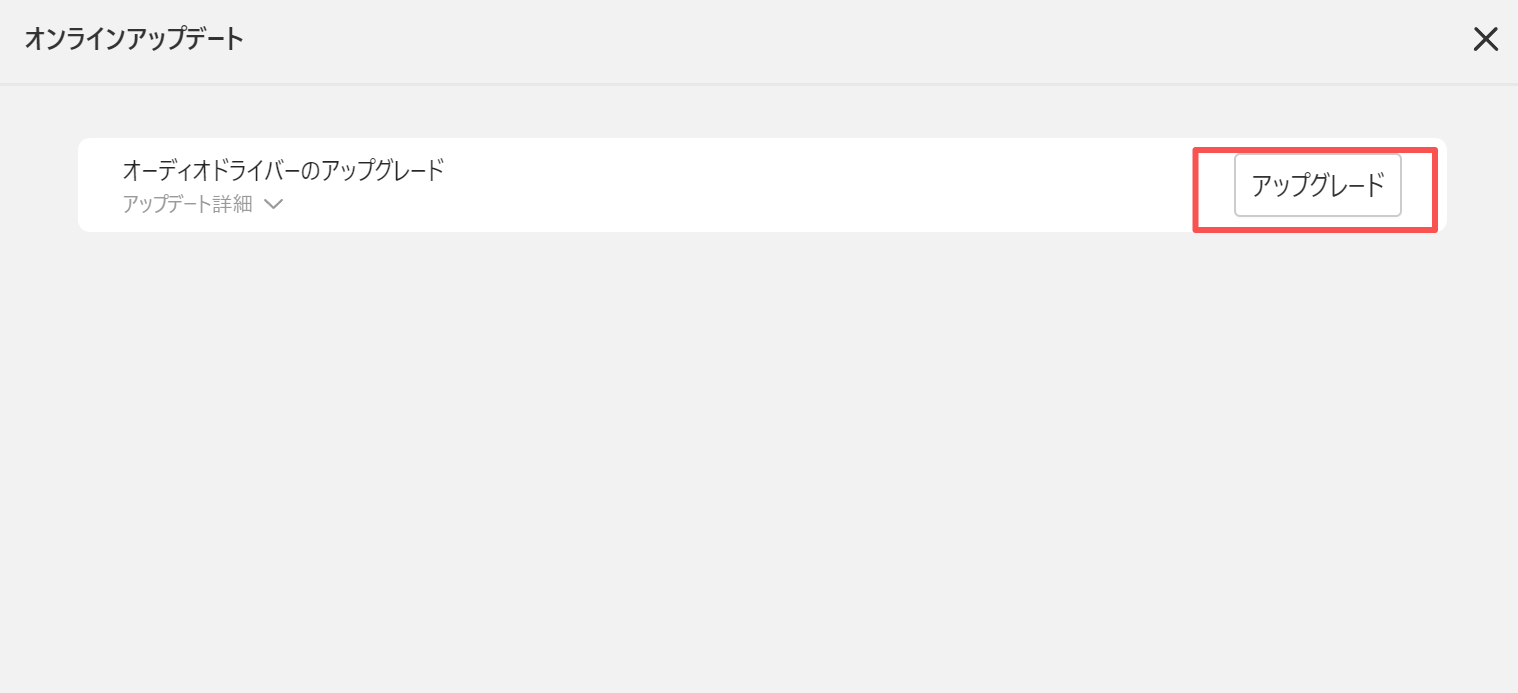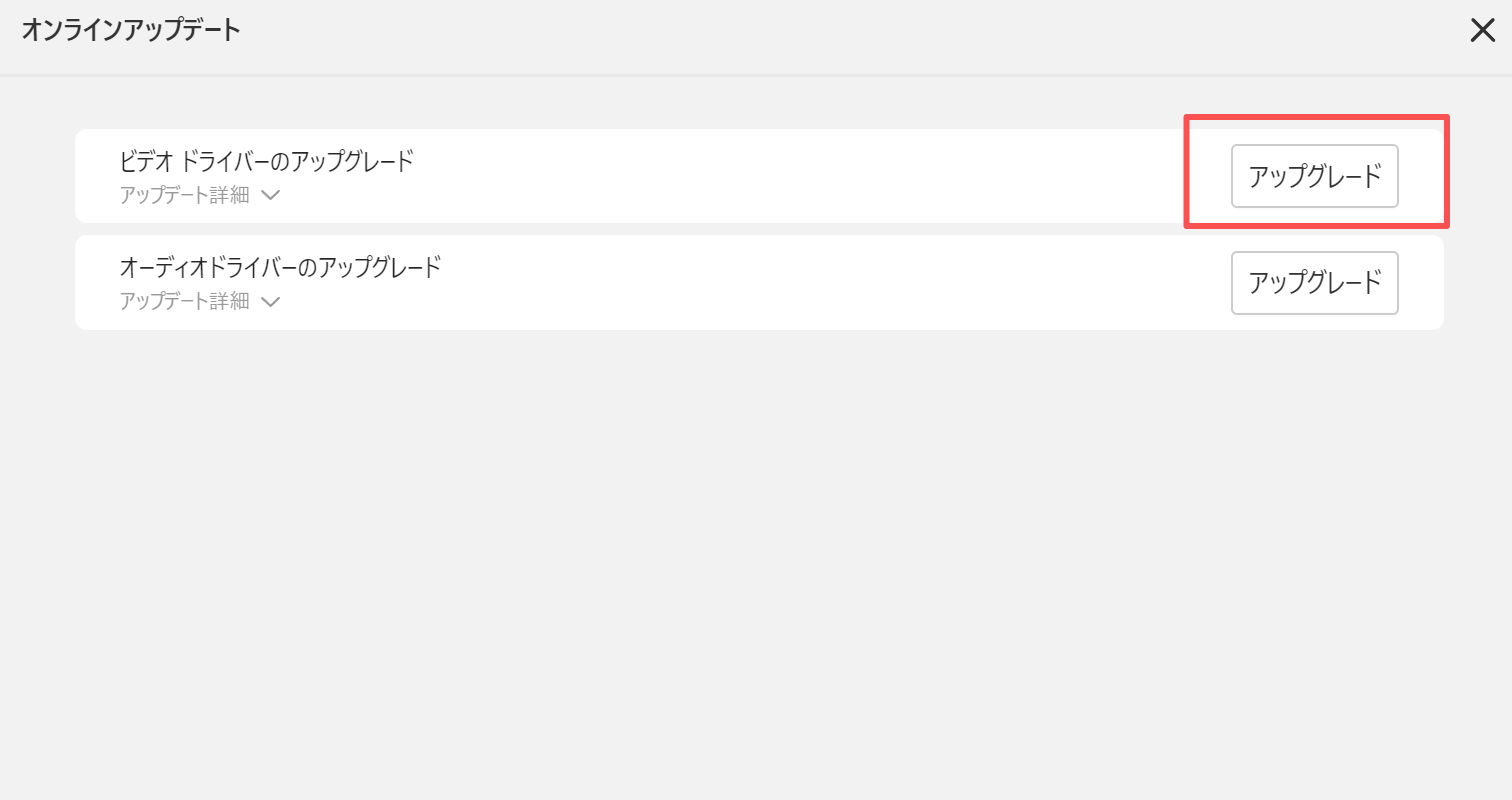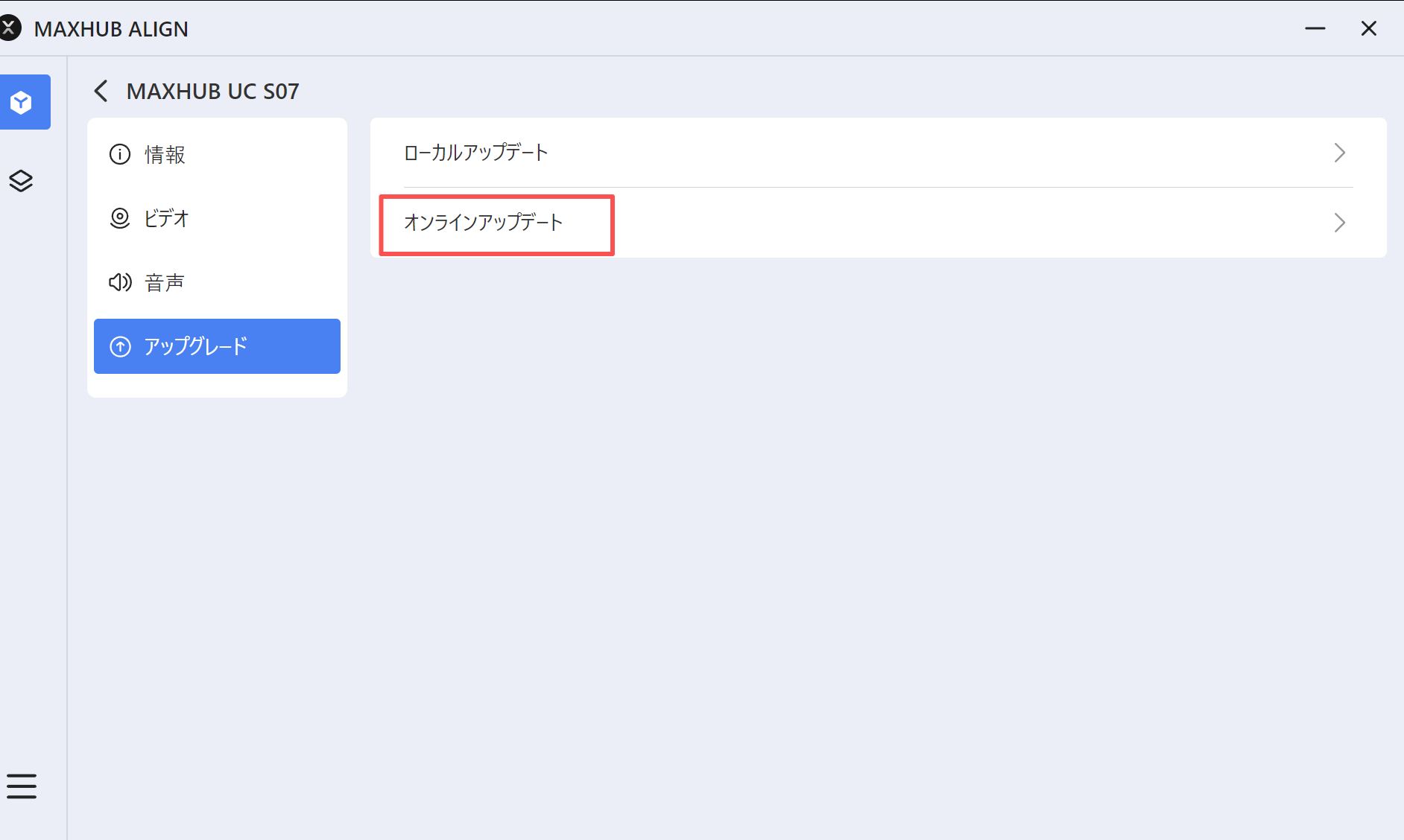 2.メニューから「アップグレード」を選び、「オンラインアップデート」をクリックします。